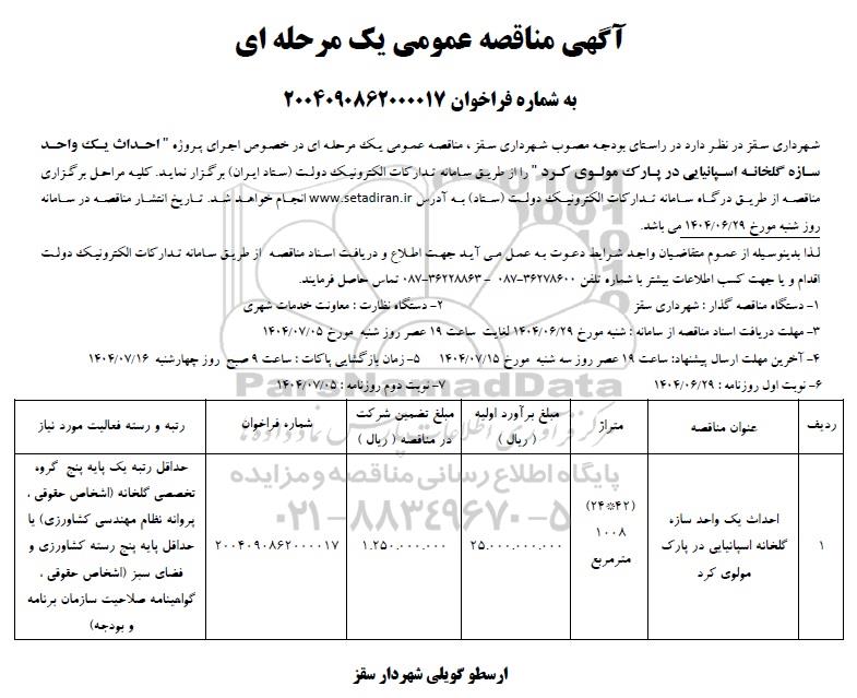 شهرداری سقز در نظر دارد در راستای بودجه مصوب شهرداری سقز، مناقصه عمومی یک مرحله ای در خصوص اجرای پروژه احداث یک واحد سازه گلخانه اسپانیایی در پارک مولوی کرد را از طریق سامانه تدارکات الکترونیک دولت ستاد ایران برگزار نماید. کلیه مراحل برگزاری مناقصه از طریق درگاه سامانه تدارکات الکترونیک دولت (ستاد) به آدرس ستاد ایران انجام خواهد شد.  تاریخ انتشار مناقصه در سامانه روز شنبه مورخ1404.6.29 می باشد.