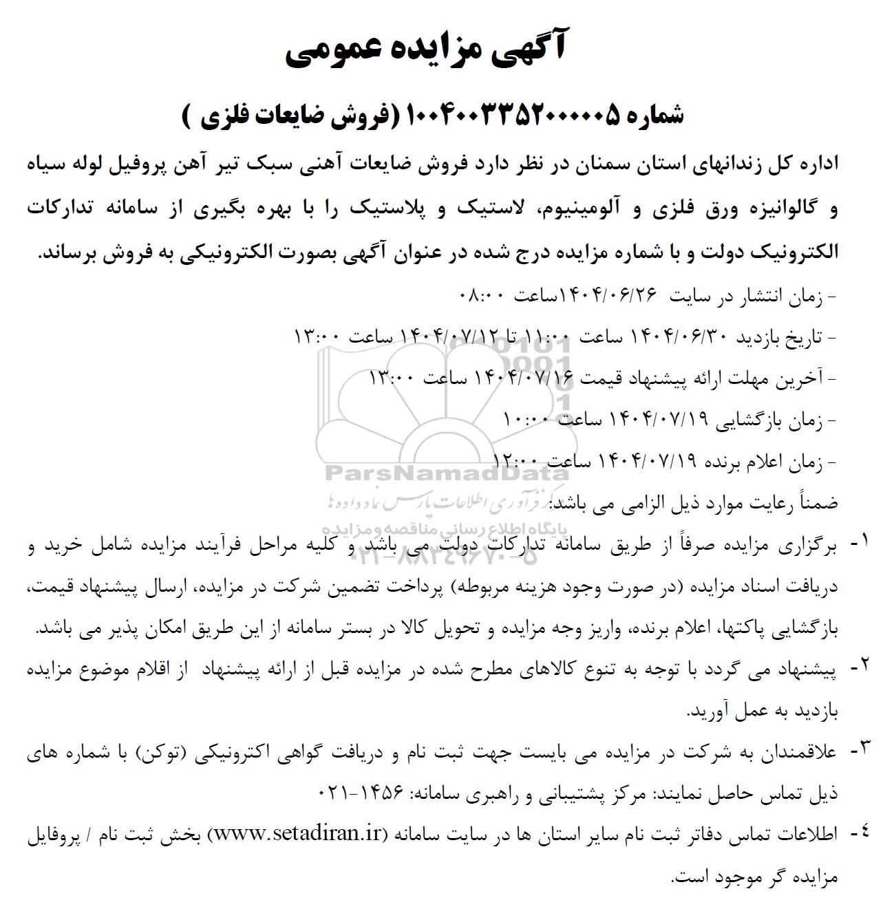اداره کل زندانهای استان سمنان در نظر دارد فروش ضایعات آهنی سبک تیر آهن پروفیل لوله سیاه و گالوانیزه ورق فلزی و آلومینیوم، لاستیک و پلاستیک را با بهره بگیری از سامانه تدارکات الکترونیک دولت و با شماره مزایده درج شده در عنوان آگهی بصورت الکترونیکی به فروش برساند.