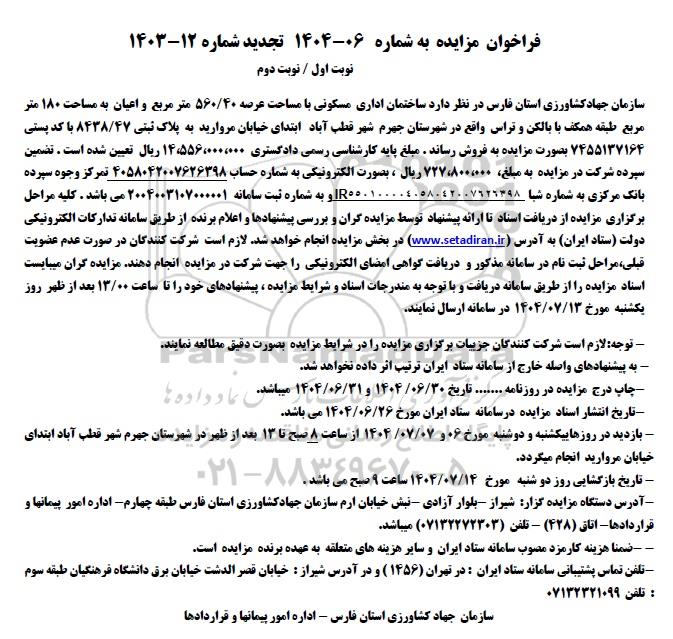 سازمان جهاد کشاورزی استان فارس در نظر دارد ساختمان اداری مسکونی با مساحت عرصه 560/40 متر مربع و اعیان به مساحت 180 متر مربع طبقه همکف با بالکن و تراس واقع در شهرستان جهرم شهر قطب آباد ابتدای خیابان مروارید به پلاک ثبتی 8438/47 با کد پستی 7455137164 بصورت مزایده به فروش رساند . مبلغ پایه کارشناسی رسمی دادگستری 14.556.000.000 ریال تعیین شده است . تضمین سپرده شرکت در مزایده به مبلغ 727.800.000 ریال، بصورت الکترونیکی به شماره حساب 4058042007626398 تمرکز وجوه سپرده بانک مرکزی به شماره شبا IR550100004058042007626398 و به شماره ثبت سامانه 2004003107000001 می باشد . کلیه مراحل برگزاری مزایده از دریافت اسناد تا ارائه پیشنهاد توسط مزایده گران و بررسی پیشنهادها و اعلام برنده از طریق سامانه تدارکات الکترونیکی دولت ستاد (ایران) به آدرس سایت ستاد در بخش مزایده انجام خواهد شد. لازم است شرکت کنندگان در صورت عدم عضویت قبلی، مراحل ثبت نام در سامانه مذکور و دریافت گواهی امضای الکترونیکی را جهت شرکت در مزایده انجام دهند. مزایده گران میبایست اسناد مزایده را از طریق سامانه دریافت و با توجه به مندرجات اسناد و شرایط مزایده، پیشنهادهای خود را تا ساعت 13:00 بعد از ظهر روز یکشنبه مورخ 1404.7.13 در سامانه ارسال نمایند.