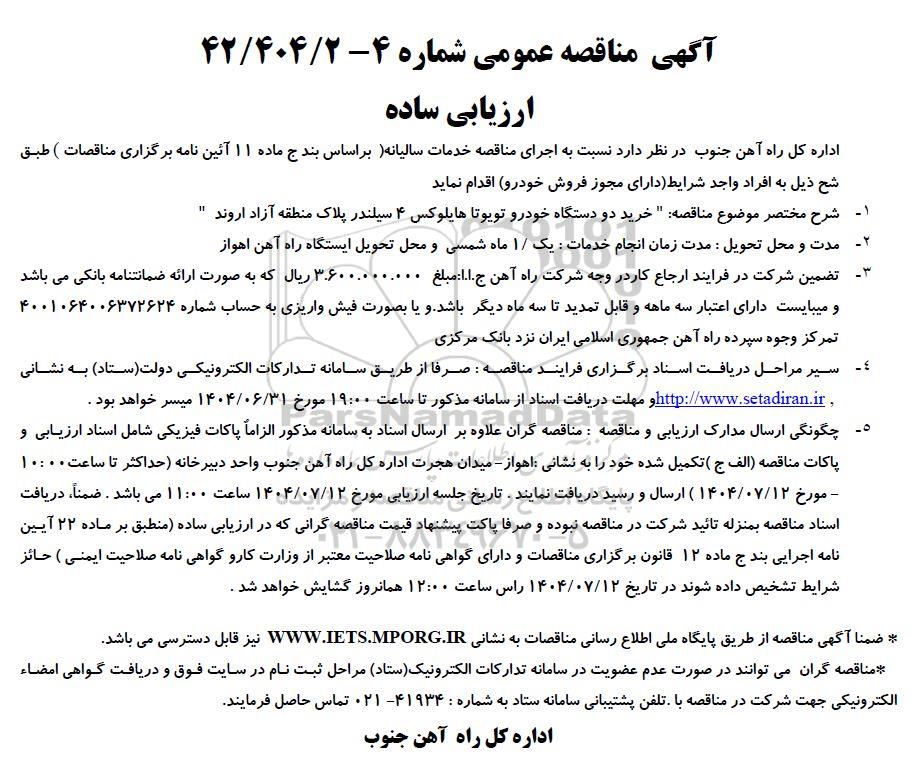 آگهی مناقصه عمومی شماره 4- 42/404/2 ارزیابی ساده