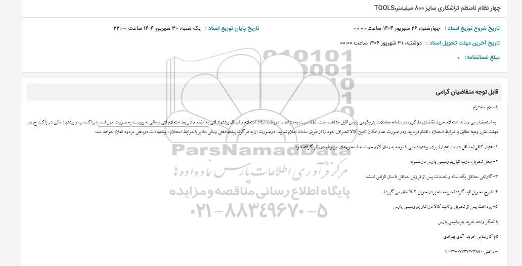 به استحضار می رساند استعلام خرید تقاضای مذکور در سامانه معاملات پتروشیمی پارس قابل مشاهده است. لطفا نسبت به مشاهده دریافت استاد استعلام و ارسال پیشنهاد فنی به انضمام شرایط استعلام فنی و مالی به پیوست به صورت مهر شده در پاکت به و پیشنهاد مالی در پاکت و در مهلت مقرر وعبنا مطابق با شرایط استعلام ، اقدام فرمایید و در صورت عدم امکان تامین کالا انصراف خود را از طریق سامانه اعلام نمایید در صورت ارائه هر گونه پیشنها دفتی و مالی مغایر با شرایط استعلام پیشنهادات دریافتی مردود اعلام خواهد شد.