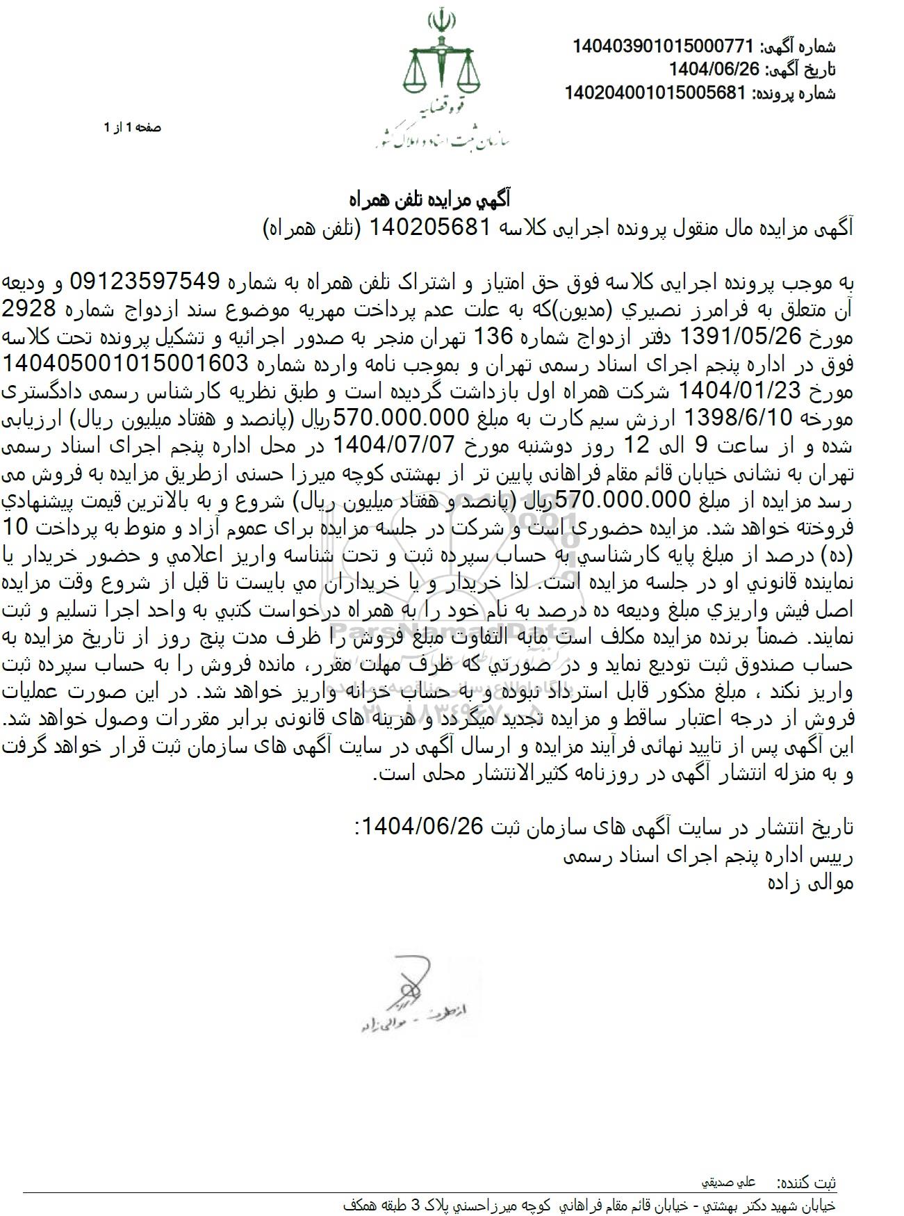 موضوع مزایده : خط تلفن همراه به شماره 09123597549