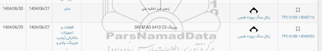 | TPC-6188-14040592 | زغال سنگ پروده طبس | بیرینگ SKF & FAG 6413 C3 | قطعات و تجهیزات مکانیکی(پمپ، بلبرینگ، واشر و ...) | 1404.6.27 | 1404.6.29 |