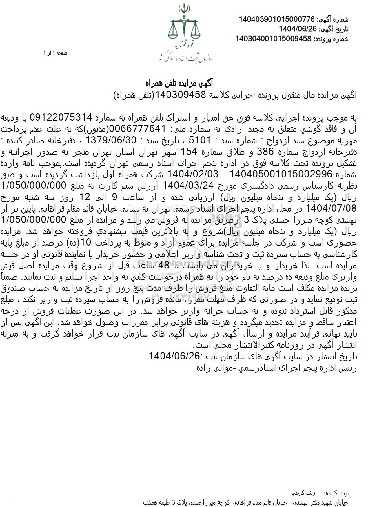 موضوع مزایده : خط تلفن همراه به شماره 09122075314