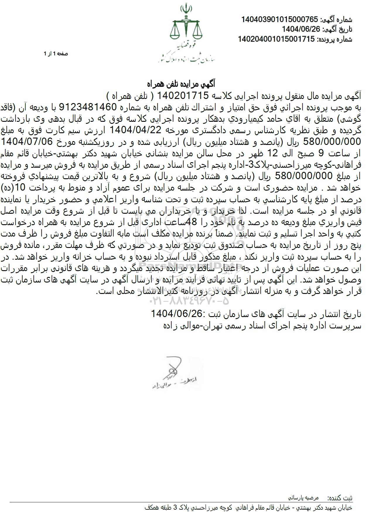 به موجب پرونده اجرائی فوق حق امتياز و اشتراک تلفن همراه به شماره 9123481460 با ودیعه آن فاقد گوشی متعلق به آقای حامد کیمیا رودي بدهکار پرونده اجرایی کلاسه فوق که در قبال بدهی وی بازداشت گردیده و طبق نظریه کارشناس رسمی دادگستری مورخه 1404.04.22 ارزش سیم کارت فوق به مبلغ 580.000.000 ریال پانصد و هشتاد میلیون ریال ارزیابی شده و در روز یکشنبه مورخ 1404.07.06 از ساعت 9 صبح الى 12 ظهر در محل سالن مزایده بنشانی خیابان شهید دکتر بهشتی - خیابان قائم مقام فراهانی- کوچه میرزاحسنی - پلاک -- اداره پنجم اجرای اسناد رسمی از طریق مزایده به فروش میرسد و مزایده از مبلغ 580.000.000 ریال پانصد و هشتاد میلیون ریال شروع و به بالاترین قیمت پیشنهادی فروخته خواهد شد. مزایده حضوری است و شرکت در جلسه مزایده برای عموم آزاد و منوط به پرداخت 10 (ده) درصد از مبلغ پایه کارشناسی به حساب سپرده ثبت و تحت شناسه واریز اعلامی و حضور خریدار یا نماینده قانوني او در جلسه مزایده است. لذا خریدار و یا خریداران می بایست تا قبل از شروع وقت مزایده اصل فيش واريزي مبلغ ودیعه ده درصد به نام خود را 48 ساعت اداری قبل از شروع مزایده به همراه درخواست كتبي به واحد اجرا تسلیم و ثبت نمایند. ضمناً برنده مزایده مکلف است ما به التفاوت مبلغ فروش را ظرف مدت پنج روز از تاریخ مزایده به حساب صندوق ثبت تودیع نماید و در صورتی که ظرف مهلت مقرر مانده فروش را به حساب سپرده ثبت واریز نکند، مبلغ مذکور قابل استرداد نبوده و به حساب خزانه واریز خواهد شد. در این صورت عملیات فروش از درجه اعتبار ساقط و مزایده تجدید میگردد و هزینه های قانونی برابر مقررات وصول خواهد شد. این آگهی پس از تایید نهایی فرآیند مزایده و ارسال آگهی در سایت آگهی های سازمان ثبت قرار خواهد گرفت و به منزله انتشار آگهی در روزنامه کثیرالانتشار محلی است.