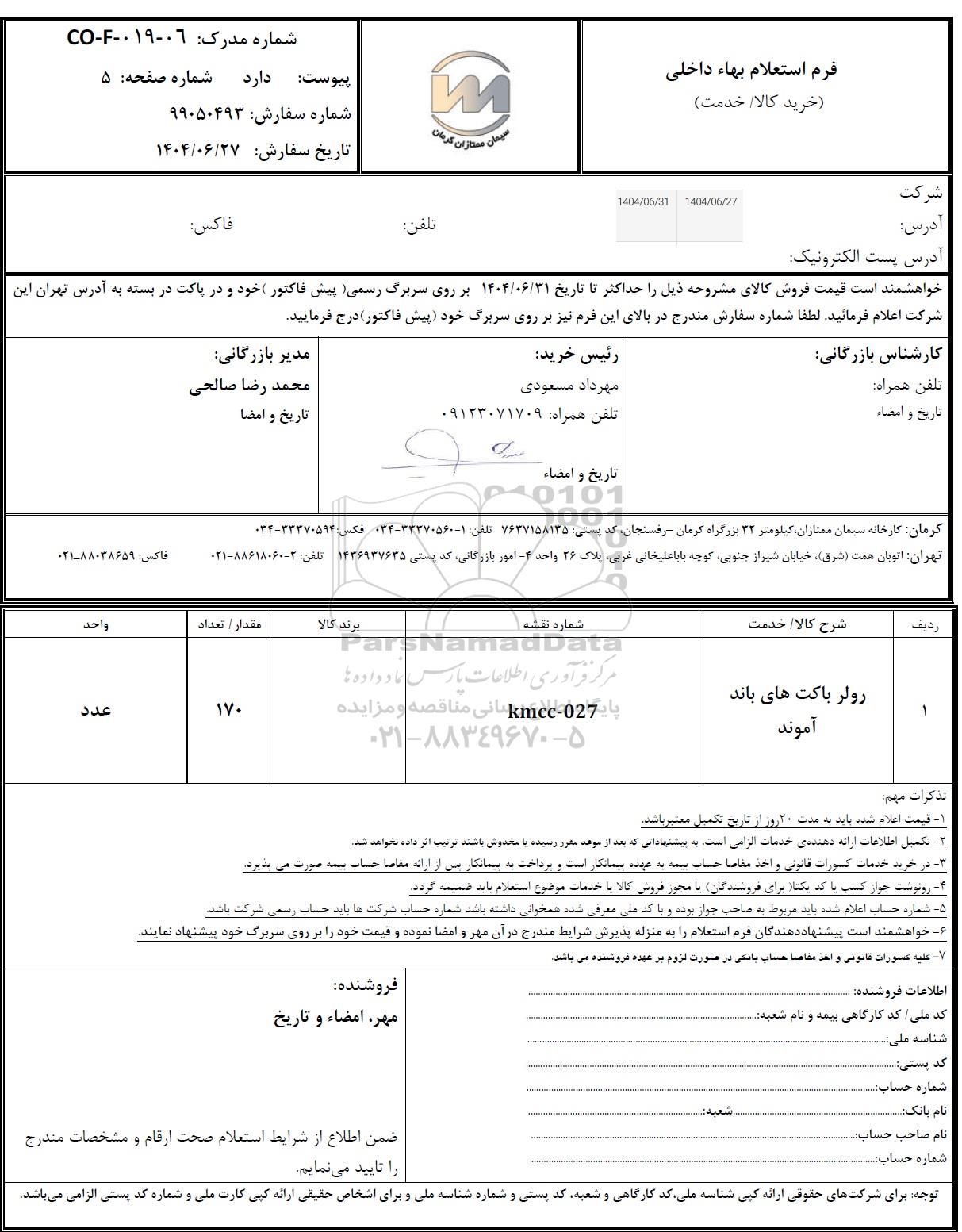 خواهشمند است قیمت فروش کالای مشروحه ذیل را حداکثر تا تاریخ 1404.6.31 بر روی سربرگ رسمی (پیش فاکتور) خود و در پاکت دربسته به آدرس تهران این شرکت اعلام فرمایید. لطفا شماره سفارش مندرج در بالای این فرم نیز بر روی سربرگ خود (پیش فاکتور) درج فرمایید.