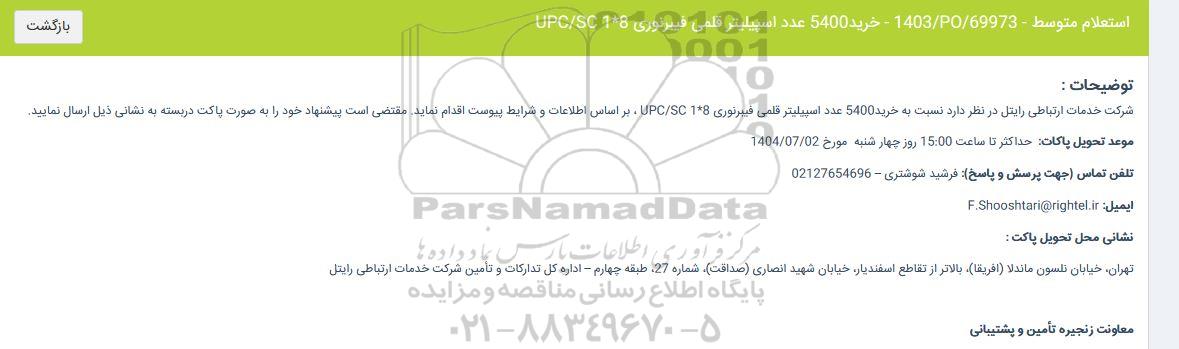 استعلام متوسط - 69973/ PO / 1403 - خرید 5400 عدد اسپیلیتر قلمی فیبر نوری 8*1 upc/sc ؟