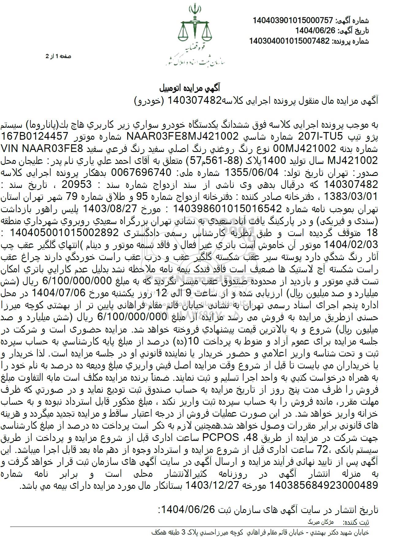 مزایده یک دستگاه خودرو سواری هاچ بک (پاناروما) سیستم پژو 207, مزایده یک دستگاه خودرو سواری هاچ بک (پاناروما) سیستم پژو 207