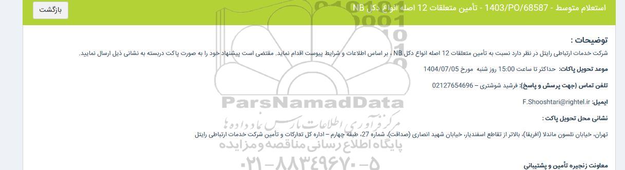 استعلام متوسط - 68587/ PO / 1403 - تامین متعلقات 12 اصله انواع دکل NB ؟