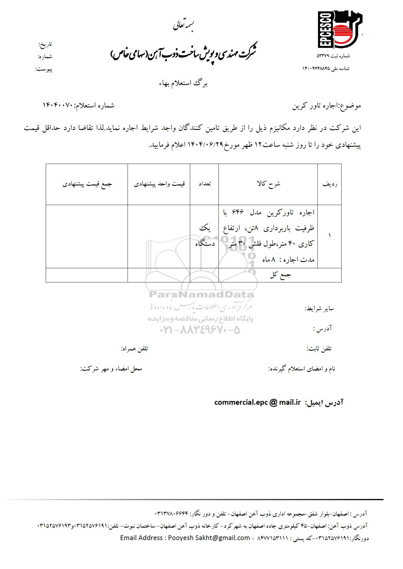 استعلام بها و موضوع استعلام استعلام اجاره تاور کرین به اطلاع کلیه شرکتها و افراد متخصص واجد شرایط میرساند، آگهی گذار در نظر دارد از طریق استعلام بها، نسبت به انتخاب و دریافت پیشنهادات اقدام نماید. این استعلام با کد آگهی ثبت شده در سامانه خبرگزاری پارس نماد : 9567889 منتشر شده است. مشخصات استعلام : تاریخ شروع استعلام: 1404/06/27 آخرین مهلت ارسال پیشنهاد قیمت : 1404/06/29 و محل اجرای پروژه : استان اصفهان میباشد. استعلام قیمت مورد درخواست : استعلام اجاره تاور کرین با دستهبندیهای تخصصی و گروه های مرتبط : جرثقیل, استعلام اطلاع رسانی میگردد. شرایط شرکت در استعلام آنلاین : ابتدا ثبت نام در سامانه استعلام پارس نماد و تکمیل مدارک موردنیاز و بارگذاری در سامانه رعایت تمامی ضوابط و الزامات مندرج در اسناد استعلام است.