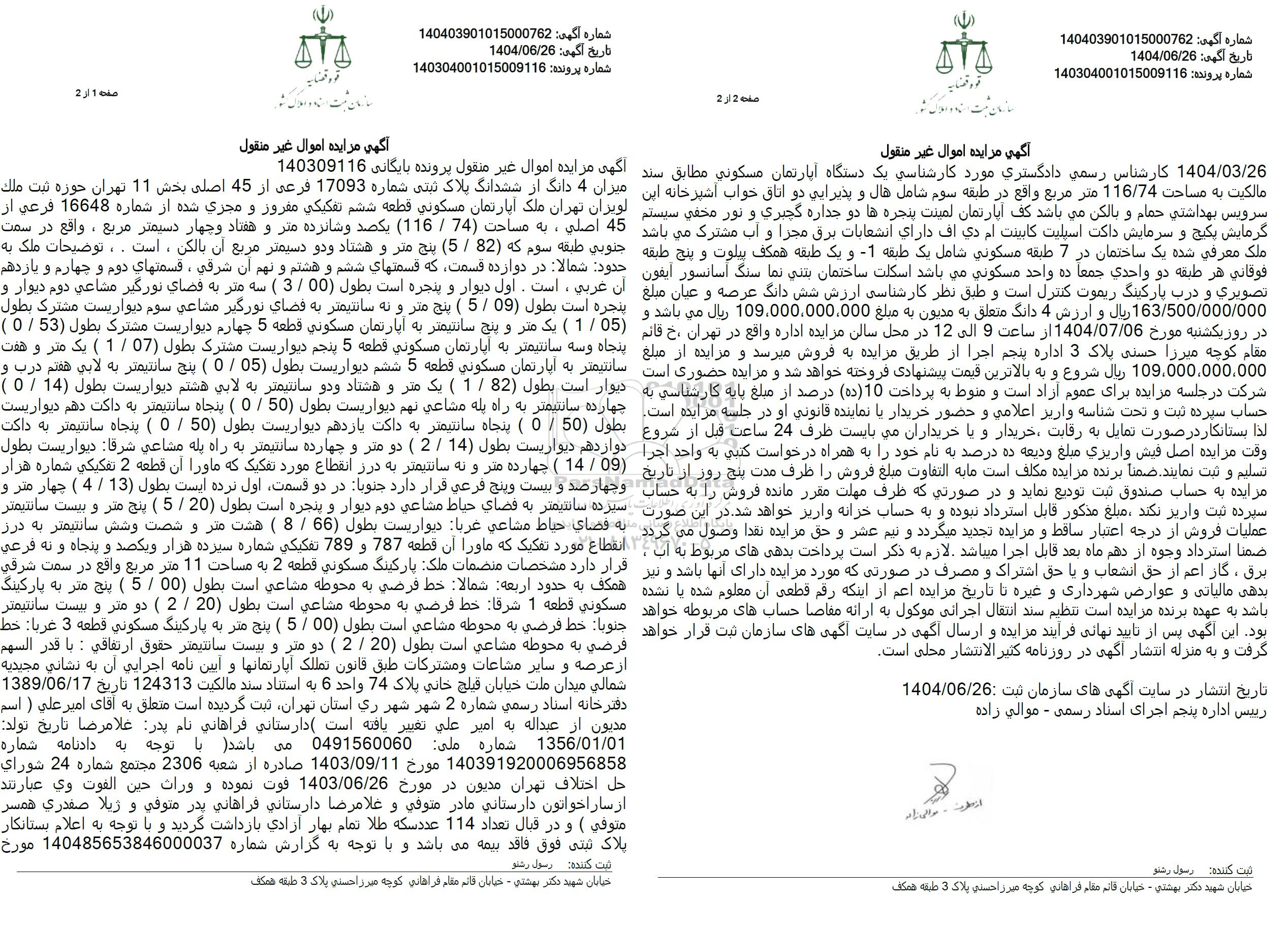 موضوع مزایده : میزان 4 دانگ از ششدانگ پلاک ثبتی شماره 17093 فرعی از 45 اصلی بخش 11 تهران حوزه ثبتی ملک لویزان تهران ملک آپارتمان مسکونی قطعه ششم تفکیکی مفروز