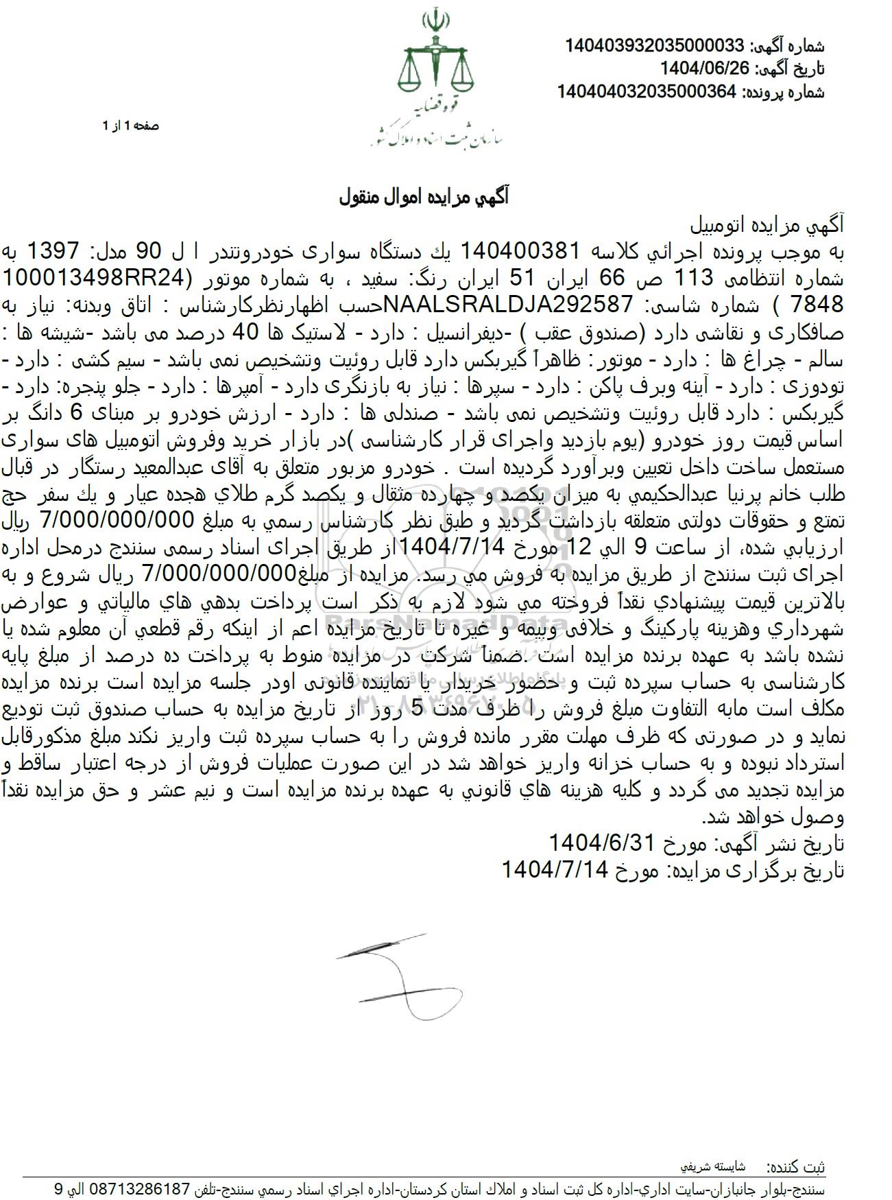 به موجب پرونده اجرائي كلاسه 140400381 يک دستگاه سواری خودرو تندر ال 90 مدل 1397 به شماره انتظامی 113 ص 66 ایران 51 ایران رنگ سفید، به شماره موتور (100013498RR24 7848 ) شماره شاسی: NAALSRALDJA292587 حسب اظهار نظر کارشناس : اتاق و بدنه نیاز به صافکاری و نقاشی دارد صندوق عقب ) - دیفرانسیل : دارد - لاستیک ها 40 درصد می باشد - شیشه ها : سالم - چراغها : دارد - موتور : ظاهرا گیربکس دارد قابل روئیت و تشخیص نمی باشد - سیم کشی : دارد -تودوزی : دارد - آینه و برف پاکن : دارد - سپرها نیاز به بازنگری دارد - امپرها : دارد - جلو پنجره دارد -گیربکس : دارد قابل روئیت و تشخیص نمی باشد - صندلی ها : دارد - ارزش خودرو بر مبنای 6 دانگ بر اساس قیمت روز خودرو (یوم بازدید و اجرای قرار کارشناسی در بازار خرید و فروش اتومبیل های سواری مستعمل ساخت داخل تعيين و برآورد گردیده است. خودرو مزبور متعلق به آقای عبدالمعید رستگار در قبال طلب خانم پرنیا عبدالحکیمی به میزان یکصد و چهارده مثقال و یکصد گرم طلای هجده عيار و يك سفر حج تمتع و حقوقات دولتی متعلقه بازداشت گردید و طبق نظر کارشناس رسمي به مبلغ 7.000.000.000 ريال ارزيابي شده از ساعت 9 الي 12 مورخ 1404.7.14 از طریق اجرای اسناد رسمی سنندج در محل اداره اجرای ثبت سنندج از طریق مزایده به فروش میرسد مزایده از مبلغ 7.000.000.000 ریال شروع و به بالاترین قیمت پیشنهادی نقدا فروخته ميشود لازم به ذکر است پرداخت بدهي هاي مالياتي و عوارض شهرداری و هزینه پارکینگ و خلافی و بیمه و غیره تا تاریخ مزایده اعم از اینکه رقم قطعی آن معلوم شده یا نشده باشد به عهده برنده مزایده است. ضمناً شرکت در مزایده منوط به پرداخت ده درصد از مبلغ پایه کارشناسی به حساب سپرده ثبت و حضور خریدار یا نماینده قانونی او در جلسه مزایده است برنده مزایده مکلف است ما به التفاوت مبلغ فروش را ظرف مدت 5 روز از تاریخ مزایده به حساب صندوق ثبت توديع نماید و در صورتی که ظرف مهلت مقرر مانده فروش را به حساب سپرده ثبت واریز نکند مبلغ مذکور قابل استرداد نبوده و به حساب خزانه واریز خواهد شد در این صورت عملیات فروش از درجه اعتبار ساقط و مزایده تجدید میگردد و کلیه هزينه هاي قانوني به عهده برنده مزایده است و نیم عشر و حق مزایده نقدا وصول خواهد شد.