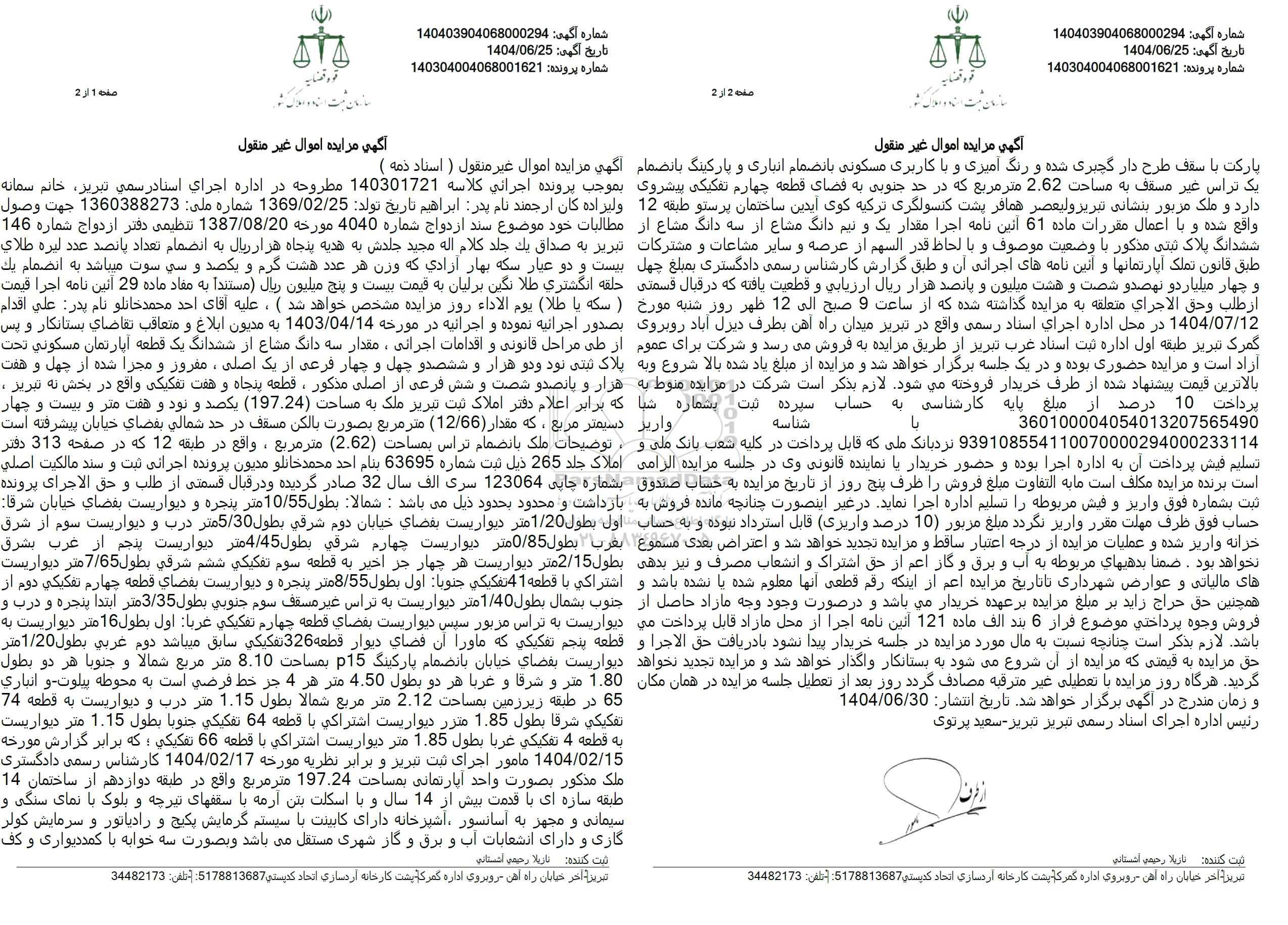 مزایده عمومی مزایده فروش مقدار سه دانگ مشاع از ششدانگ یک قطعه آپارتمان مسکونی به پلاک ثبتی نود و دو هزار و ششصد و چهل و چهار فرعی برگزار میگردد. از کلیه افراد متخصص و شرکتهای واجد شرایط دعوت به عمل میآید تا در این مزایده با کد خبرگزاری پارس نماد : 9567916 شرکت نمایند تاریخ شروع مزایده : 1404/06/27 مهلت شرکت در مزایده: تا پایان روز 1404/07/12