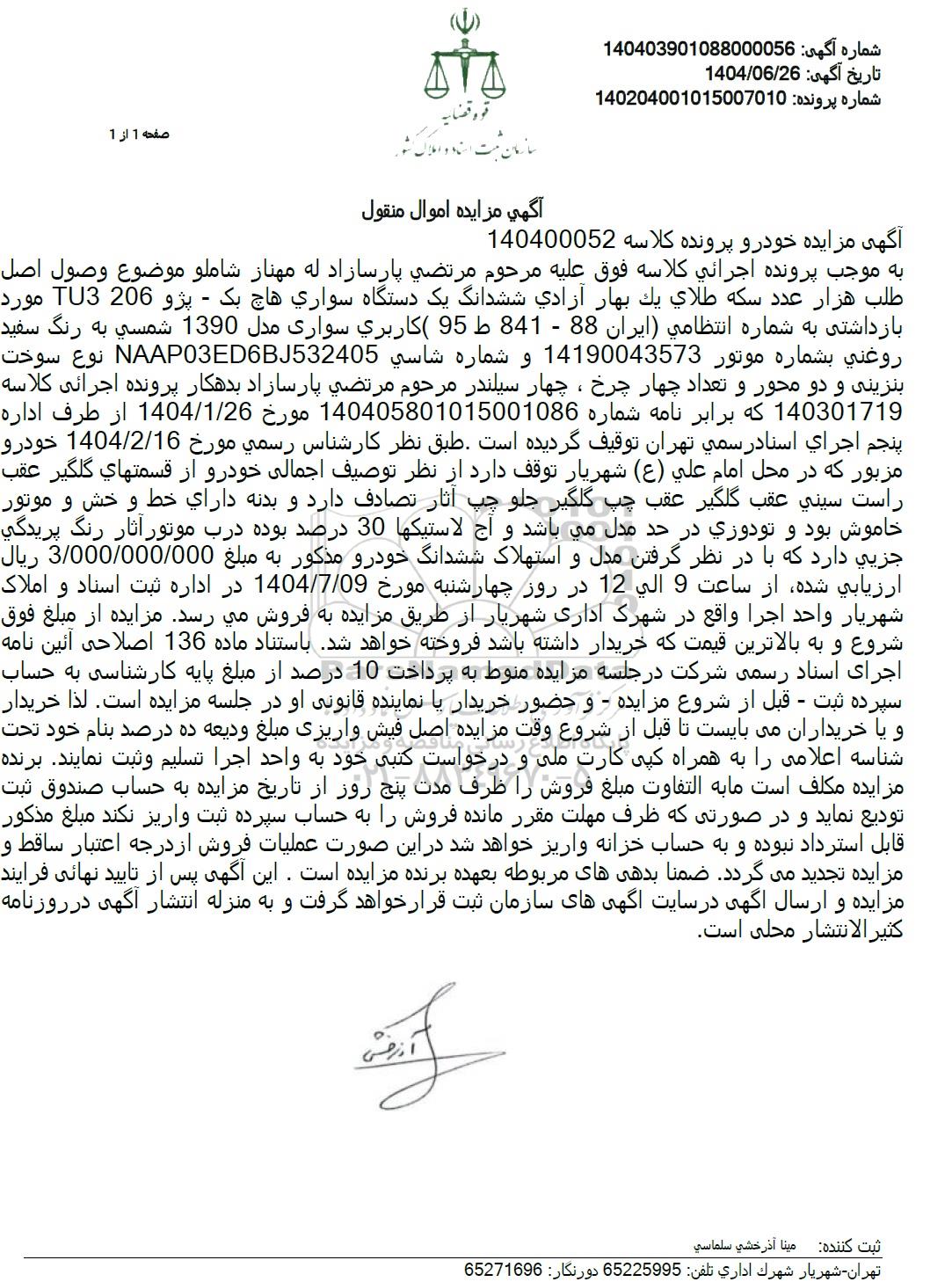 آگهی مزایده خودرو پرونده کلاسه 140400052