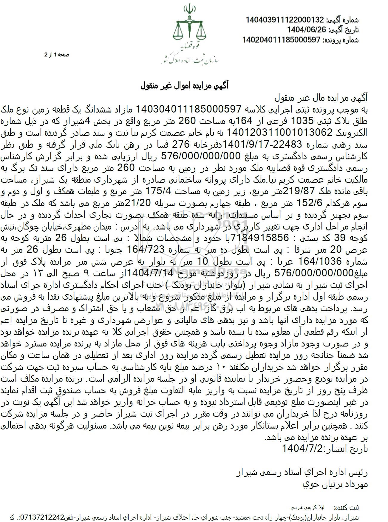 آگهی مزایده مال غیر منقول به موجب پرونده ثبتی اجرایی کلاسه 140304011185000597 مازاد ششدانگ یک قطعه زمین نوع ملک طلق پلاک ثبتی 1035 فرعی از 164 به مساحت 260 متر مربع واقع در بخش 4 شیراز که در ذیل شماره الکترونیک 140120311001013062 به نام خانم عصمت کریم نیا ثبت و سند صادر گردیده است و طبق سند رهنی شماره 22483-1401/9/17 دفتر خانه 276 فسا در رهن بانک ملی قرار گرفته و طبق نظر کارشناس رسمی دادگستری به مبلغ 576.000.000./000 ریال ارزیابی شده و برابر گزارش کارشناس رسمی دادگستری قوه قضاییه ملک مورد نظر در زمین به مساحت 260 متر مربع، دارای سند تک برگ به مالکیت خانم عصمت کریم نیا ملک دارای پروانه ساختمانی صادره از شهرداری منطقه یک شیراز مساحت باقی مانده ملک 219/87 متر مربع زیر زمین به مساحت 175/4 متر مربع و طبقات همکف و اول و دوم و سوم هر کدام 152/6 متر مربع ، طبقه چهارم بصورت سرپله 21/20 متر مربع میباشد که ملک در طبقه سوم تجهیز گردیده و بر اساس مستندات ارائه شده طبقه همکف بصورت تجاری احداث گردیده و در حال انجام مراحل اداری جهت تغییر کاربری در شهرداری میباشد به آدرس : میدان مطهری، خیابان چوگان، نبش کوچه 39 کدپستی : 7184915856 با حدود و مشخصات شمالا : پی است بطول 26 متر به کوچه به عرض 20 متر شرقا : پی است بطول ده متر به شماره 164/723 جنوبا : پی است بطول 26 متر به شماره 164/1036 غربا : پی است بطول 10 متر به بلوار به عرض شش متر مزایده پلاک فوق از مبلغ 576.000.000.000 ریال در روز دوشنبه مورخ 1404.7.14 از ساعت 9 صبح الی 12 در محل اجرای ثبت شیراز به نشانی : شیراز، (بلوار جانبازان پودنک) جنب اجرای احکام دادگستری اداره جرای اسناد رسمی طبقه اول اداره برگزار و مزایده از مبلغ مذکور شروع و به بالاترین مبلغ پیشنهادی نقدا به فروش می رسد. پرداخت بدهی های مربوط به آب برق گاز اعم از حق انشعاب و یا حق اشتراک و مصرف در صورتی که مورد مزایده دارای آنها باشد و نیز بدهی های مالیاتی و عوارض شهرداری و غیره تا تاریخ مزایده اعمی از اینکه رقم قطعی آن معلوم شده یا نشده باشد و همچنین حقوق اجرایی کلا به عهده برنده مزایده خواهد بود و در صورت وجود مازاد وجوه پرداختی بابت هزینه های فوق از محل مازاد به برنده مزایده مسترد خواهد شد ضمنا چنانچه روز مزایده تعطیل رسمی گردد مزایده روز اداری بعد از تعطیلی در همان ساعت و مکان مقرر برگزار خواهد شد خریداران مکلفند 10 درصد مبلغ پایه کارشناسی به حساب سپرده ثبت جهت شرکت در مزایده تودیع و حضور خریدار یا نماینده قانونی او در جلسه مزایده الزامی است برنده مزایده مکلف است. ظرف پنج روز از تاریخ مزایده نسبت به واریز مابه التفاوت مبلغ فروش به حساب صندوق ثبت اقدام نمایند در غیر اینصورت مبلغ تودیعی قابل استرداد نبوده و به حساب خزانه واریز خواهد شد این آگهی یک نوبت در روزنامه درج لذا خریداران میتوانند در وقت مقرر در اجرای ثبت شیراز حاضر و در جلسه مزایده شرکت کنند . همچنین برابر اعلام بستانکار مورد رهن برابر بیمه نوین بیمه میباشد مسئولیت هرگونه بدهی احتمالی بر عهده برنده مزایده می باشد.
