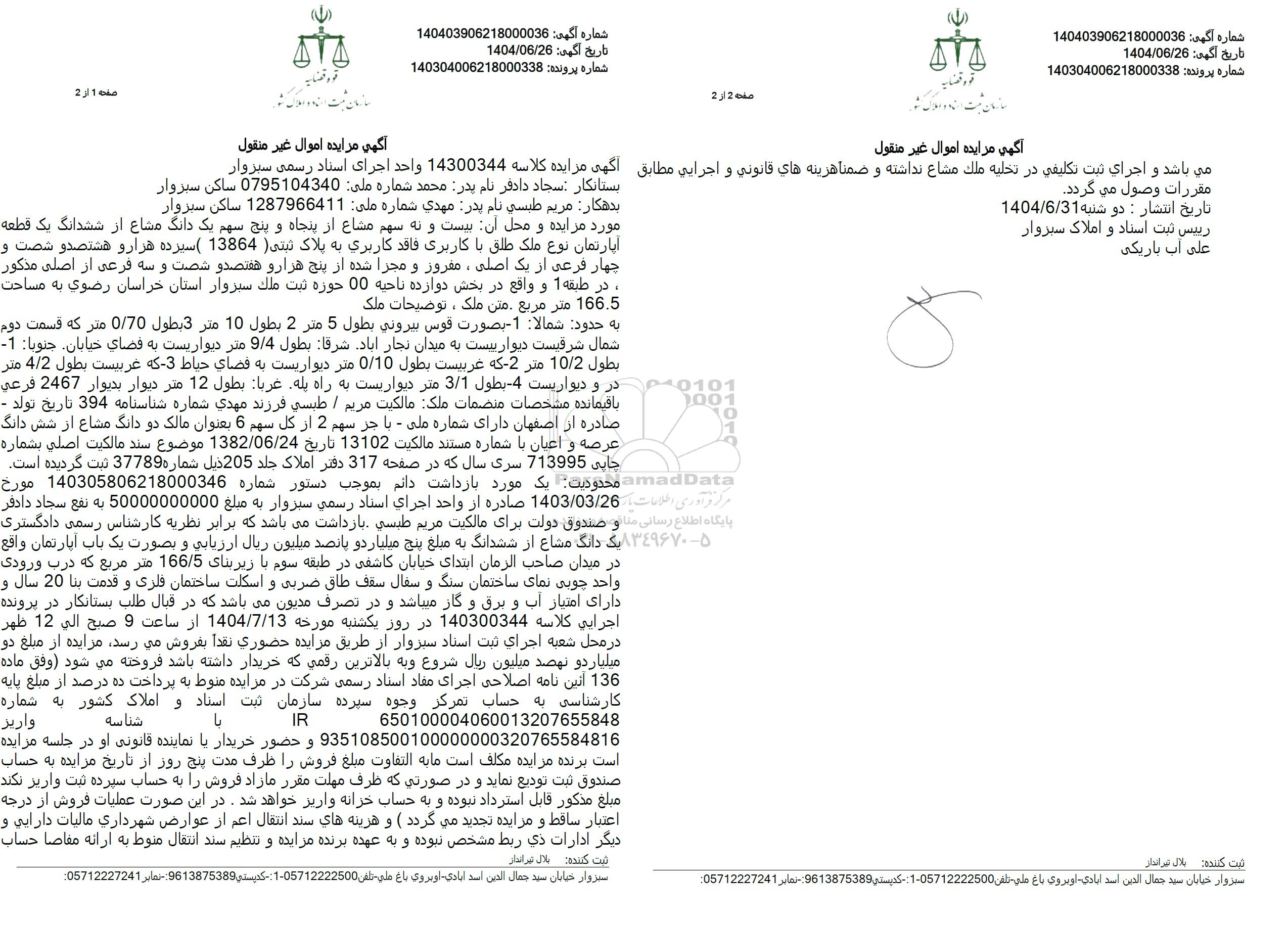 به حدود شمالا -1 - بصورت قوس بيروني بطول 5 متر 2 بطول 10 متر 3 بطول 0/70 متر که قسمت دوم شمال شرقیست دیوار بیست به میدان نجار آباد شرقا بطول 9/4 متر دیواریست به فضاي خيابان جنوبا -1-بطول 10/2 متر -2 که غربیست بطول 0/10 متر دیواریست به فضای حیاط - که غربیست بطول 4/2 متر در و دیواریست -4 بطول 3/1 متر دیواریست به راه پله غربا بطول 12 متر دیوار بديوار 2467 فرعي باقیمانده مشخصات منضمات ملک مالکیت مریم / طبسي فرزند مهدی شماره شناسنامه 394 تاریخ تولد -صادره از اصفهان دارای شماره ملی - با جز سهم 2 از کل سهم 6 بعنوان مالک دو دانگ مشاع از شش دانگ عرصه و اعیان با شماره مستند مالکیت 13102 تاریخ 1382.06.24 موضوع سند مالكيت اصلي بشماره چاپی 713995 سری سال که در صفحه 317 دفتر املاک جلد 205 ذيل شماره 37789 ثبت گردیده است. محدودیت یک مورد بازداشت دائم بموجب دستور شماره 140305806218000346 مورخ 1403/03/26 صادره از واحد اجرای اسناد رسمي سبزوار به مبلغ 50000000000 به نفع سجاد دادفر و صندوق دولت برای مالکیت مریم طبسي بازداشت میباشد که برابر نظریه کارشناس رسمی دادگستری یک دانگ مشاع از ششدانگ به مبلغ پنج میلیارد و پانصد میلیون ریال ارزیابی و بصورت یک باب آپارتمان واقع در میدان صاحب الزمان ابتدای خیابان کاشفی در طبقه سوم با زیربنای 166.5 متر مربع که درب ورودی واحد چوبی نمای ساختمان سنگ و سفال سقف طاق ضربی و اسکلت ساختمان فلزی و قدمت بنا 20 سال و دارای امتیاز آب و برق و گاز میباشد و در تصرف مدیون میباشد که در قبال طلب بستانکار در پرونده اجرايي كلاسه 140300344 در روز یکشنبه مورخه 1404.7.13 از ساعت 9 صبح الی 12 ظهر در محل شعبه اجراي ثبت اسناد سبزوار از طریق مزایده حضوري نقداً بفروش مي رسد مزایده از مبلغ دو میلیارد و نهصد میلیون ریال شروع و به بالاترین رقمی که خریدار داشته باشد فروخته مي شود وفق ماده 136 آئین نامه اصلاحی اجرای مفاد اسناد رسمی شرکت در مزایده منوط به پرداخت ده درصد از مبلغ پایه کارشناسی به حساب تمرکز وجوه سپرده سازمان ثبت اسناد و املاک کشور به شماره واریز شناسه IR650100004060013207655848 یا 935108500100000000320765584816 و حضور خریدار یا نماینده قانونی او در جلسه مزایده است برنده مزایده مکلف است ما به التفاوت مبلغ فروش را ظرف مدت پنج روز از تاریخ مزایده به حساب صندوق ثبت تودیع نماید و در صورتی که ظرف مهلت مقرر مازاد فروش را به حساب سپرده ثبت واریز نکند مبلغ مذکور قابل استرداد نبوده و به حساب خزانه واریز خواهد شد. در این صورت عملیات فروش از درجه اعتبار ساقط و مزایده تجدید میگردد ) و هزینه هاي سند انتقال اعم از عوارض شهرداري ماليات دارايي و دیگر ادارات ذي ربط مشخص نبوده و به عهده برنده مزایده و تنظیم سند انتقال منوط به ارائه مفاصا حساب می با شد و اجرای ثبت تکلیفی در تخلیه ملک مشاع نداشته و ضمنا هزینه های