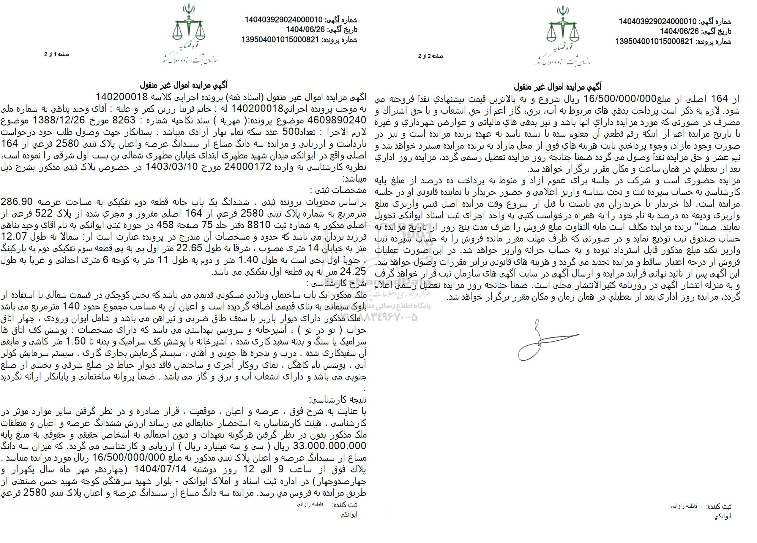 ارزش ششدانگ عرصه و اعیان و متعلقات ملک مذکور بدون در نظر گرفتن هرگونه تعهدات و دیون احتمالی به اشخاص حقیقی و حقوقی به مبلغ پایه 33.000.000.000 ریال ( سی و سه میلیارد ریال ) ارزیابی و کارشناسی می گردد. که میزان سه دانگ مشاع از ششدانگ عرصه و اعیان پلاک ثبتی مذکور به مبلغ 16.500.000.000 ريال مورد مزایده میباشد . بلاك فوق از ساعت 9 الی 12 روز دوشنبه 1404.07.14 چهاردهم مهر ماه سال یکهزار و چهار صد و چهار در اداره ثبت اسناد و املاک ایوانکی