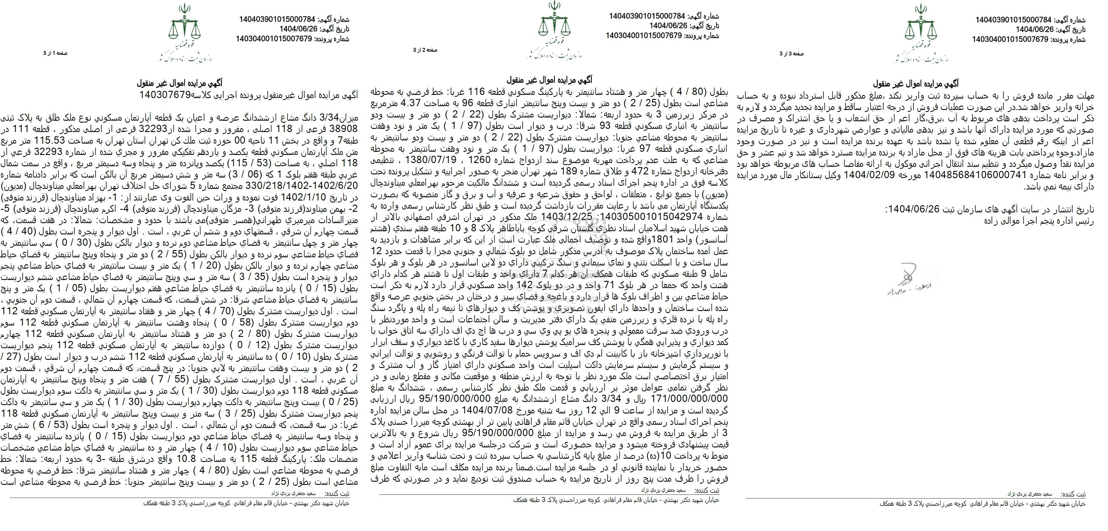 موضوع مزایده : میزان 3/34 دانگ مشاع از ششدانگ عرصه و اعیان یک قطعه آپارتمان مسکونی نوع ملک طلق به پلاک ثبتی 38908 فرعی از 118 اصلی ، مفروز و مجزا شده از 32293 فرعی از اصلی مذکور ، قطعه 111 در طبقه 7 و واقع در بخش 11 ناحیه 00 حوزه ثبت ملک کن تهران، استان تهران به مساحت 115.53 متر مربع متن ملک آپارتمان مسکونی قطعه یکصد و یازدهم تفکیکی مفروز و مجزی شده از شماره 32293 فرعی از 118 اصلی ، به مساحت 53 / (115) یکصد و پانزده متر و پنجاه و سه دسیمتر مربع ، واقع در سمت شمال غربی طبقه هفتم بلوک 1 که (06) / (3) سه متر و شش دسیمتر مربع آن بالکن است به ارزش (ششدانگ : 171.000.000.000 ریال و 3/34 دانگ به ارزش : 95.190.000.000 ریال)