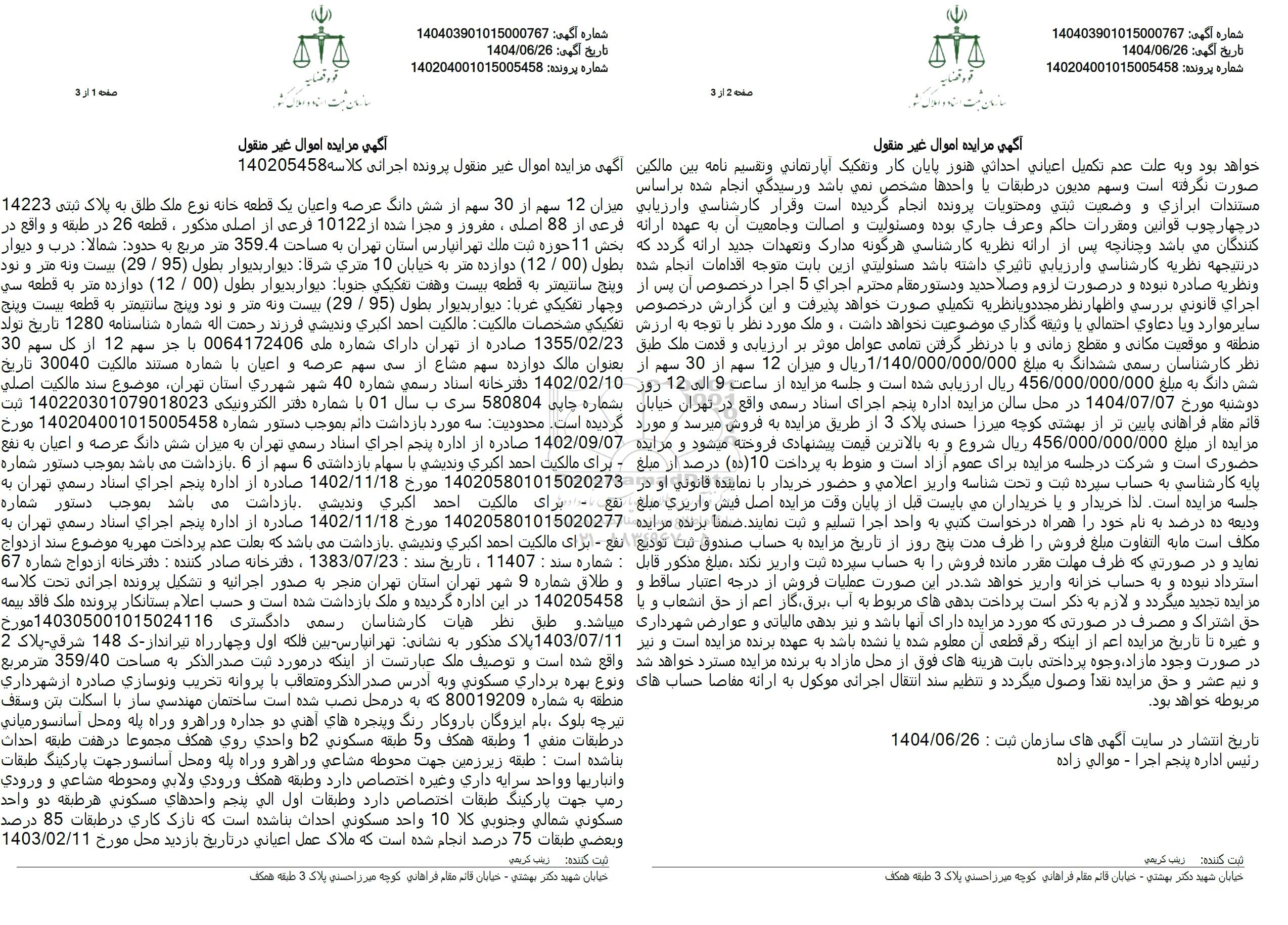 مزایده میزان 12 سهم از 30 سهم از شش دانگ عرصه و اعیان یک قطعه خانه به پلاک ثبتی 14223 فرعی از 88 اصلی مفروز و مجزا شده از 10122 فرعی از اصلی مذکور به مساحت 359.4 متر مربع