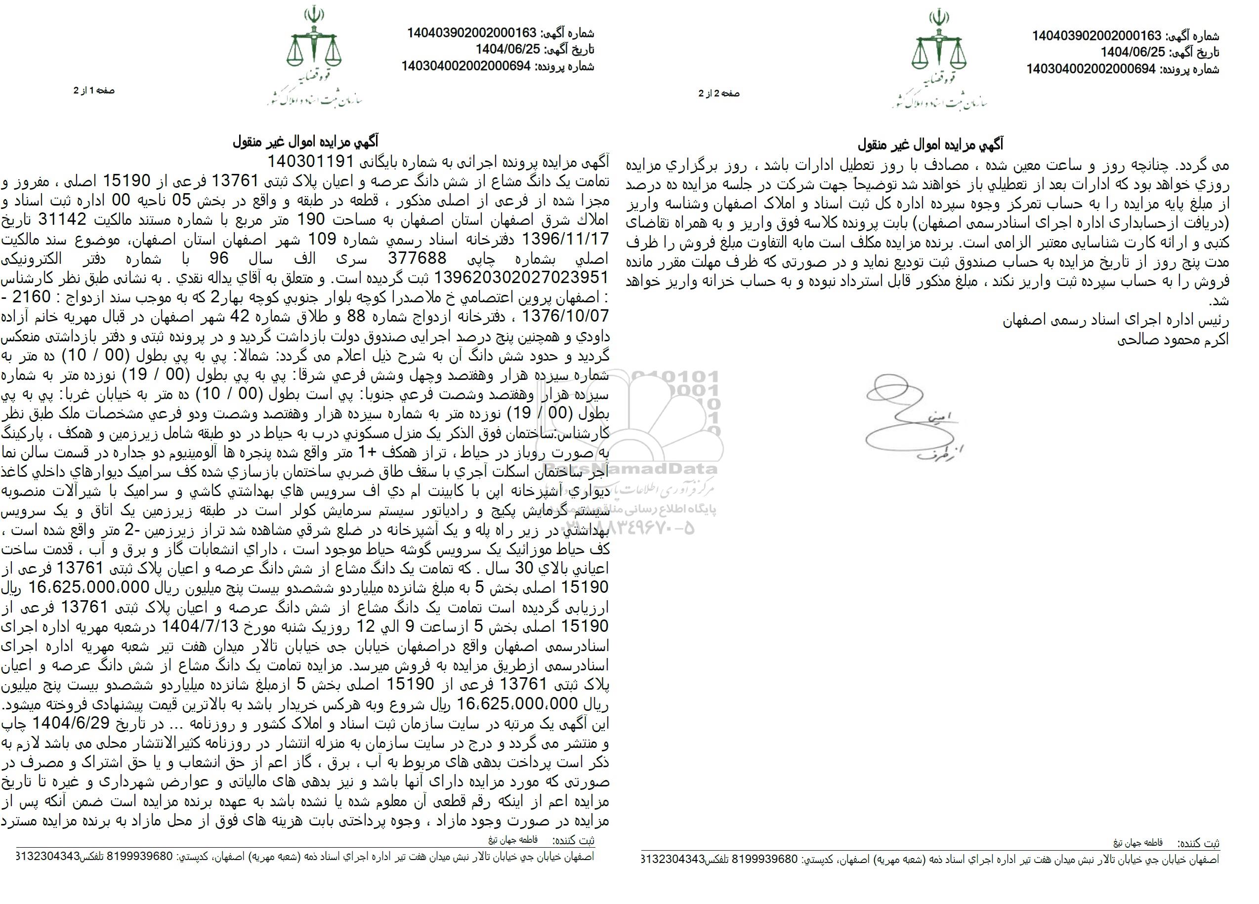 تمامت یک دانگ مشاع از شش دانگ عرصه و اعیان پلاک ثبتی 13761 فرعی از 15190 اصلی ، مغرور و مجزا شده از فرعی از اصلی مذکور، قطعه در طبقه و واقع در بخش 05 ناحیه 00 اداره ثبت اسناد و املاك شرق اصفهان استان اصفهان به مساحت 190 متر مربع با شماره مستند مالکیت 31142 تاریخ 1396/11/17 دفترخانه اسناد رسمی شماره 109 شهر اصفهان استان اصفهان موضوع سند مالکیت اصلي بشماره جایی 377688 سری الف سال 96 با شماره دفتر الکترونیکی 139620302027023951 ثبت گردیده است و متعلق به آقاي بداله نقدی به نشانی طبق نظر کارشناس اصفهان پروین اعتصامی خ ملا صدرا کوچه بلوار جنوبی کوچه بهار 2 که به موجب سند ازدواج : 2160 -1376.10.07 ، دفترخانه ازدواج شماره 88 و طلاق شماره 42 شهر اصفهان در قبال مهریه خانم آزاده داودی و همچنین پنج درصد اجرایی صندوق دولت بازداشت گردید و در پرونده ثبتی و دفتر بازداشتی منعکس گردید و حدود شش دانگ آن به شرح ذیل اعلام می گردد شمالا پي به بي بطول (00 .10) ده متر به شماره سیزده هزار و هفتصد وجهل وشش فرعي شرقا بي به پي بطول (00 . 19) نوزده متر به شماره سیزده هزار و هفتصد و شصت فرعي جنوبا بي است بطول 00 . 10) ده متر به خیابان غربا پي به پي بطول (00 . 19 نوزده متر به شماره سپرده هزار و هفتصد و شصت و دو فرعي مشخصات ملک طبق نظر کارشناس ساختمان فوق الذکر یک منزل مسکونی درب به حیاط در دو طبقه شامل زیر زمین و همکف، پارکینگ به صورت روباز در حیاط تراز همکف + 1 متر واقع شده پنجره ها آلومینیوم دو جداره در قسمت سالن نما اجر ساختمان اسکات اخري با سقف طاق ضربي ساختمان بازسازی شده کف سرامیک دیوارهای داخلی کاغذ دیواری آشپزخانه این با کابینت ام دی اف سرویس های بهداشتی کاشی و سرامیک با شیرآلات منصوبه سیستم گرمایش پکیج و رادیاتور سیستم سرمایش کولر است در طبقه زیرزمین یک اتاق و یک سرویس بهداشتی در زیر راه پله و یک آشپزخانه در ضلع شرقی مشاهده شد تراز زیر زمین 2 متر واقع شده است . کف حیاط موراتیک یک سرویس گوشه حیاط موجود است. دارای انشعابات گار و برق و آب ، قدمت ساخت اعياني بالاي 30 سال که تمامت یک دانگ مشاع از شش دانگ عرصه و اعیان پلاک تبنی 13761 فرعی از 15190 اصلی بخش 5 به مبلغ شانزده میلیارد و ششصد و بیست پنج میلیون ریال 16.625,000,000 ريال ارزیابی گردیده است تمامت یک دانگ مشاع از شش دانگ عرصه و اعیان پلاک ثبتی 13761 فرعی از 15190 اصلی بخش 5 از ساعت 9 الى 12 روز یک شنبه مورخ 1404.7.13 در شعبه مهریه اداره اجرای اسنادرسمی اصفهان واقع در اصفهان خیابان جی خیابان تالار میدان هفت تیر شعبه مهریه اداره اجرای اسنادرسمی از طریق مزایده به فروش میرسد. مزایده تمامت یک دانگ مشاع از شش دانگ عرصه و اعیان پلاک ثبتی 13761 فرعی از 15190 اصلی بخش 5 از مبلغ شانزده میلیارد و ششصد و بیست پنج میلیون ريال 16,625,000,000 ریال شروع و به هر کس خریدار باشد به بالاترین قیمت پیشنهادی فروخته میشود. این آگهی یک مرتبه در سایت سازمان ثبت اسناد و املاک کشور و روزنامه در تاریخ 1404/6/29 چاپ و منتشر میگردد و درج در سایت سازمان به منزله انتشار در روزنامه کثیر الانتشار محلی می باشد لازم به ذکر است پرداخت بدهی های مربوط به آب، برق، گار اعم از حق انشعاب و یا حق اشتراک و مصرف در صورتی که مورد مزایده دارای آنها باشد و نیز بدهی های مالیاتی و عوارض شهرداری و غیره تا تاریخ مزایده اعم از اینکه رقم قطعی آن معلوم شده یا نشده باشد به عهده برنده مزایده است ضمن آنکه پس از مزایده در صورت وجود مازاد، وجوه پرداختی بابت هزینه های فوق از محل مازاد به برنده مزایده مسترد می گردد. چنانچه روز و ساعت معین شده، مصادف با روز تعطیل ادارات باشد. روز برگزاری مزایده روزی خواهد بود که ادارات بعد از تعطیلی باز خواهند شد توضیحاً جهت شرکت در جلسه مزایده ده درصد از مبلغ پایه مزایده را به حساب تمرکز وجوه سپرده اداره کل ثبت اسناد و املاک اصفهان و شناسه واربر دریافت از حسابداری اداره اجرای اسنادرسمی (اصفهان) بابت پرونده کلاسه فوق واربر و به همراه تقاضای کتبی و ارائه کارت شناسایی معتبر الزامی است. برنده مزاید