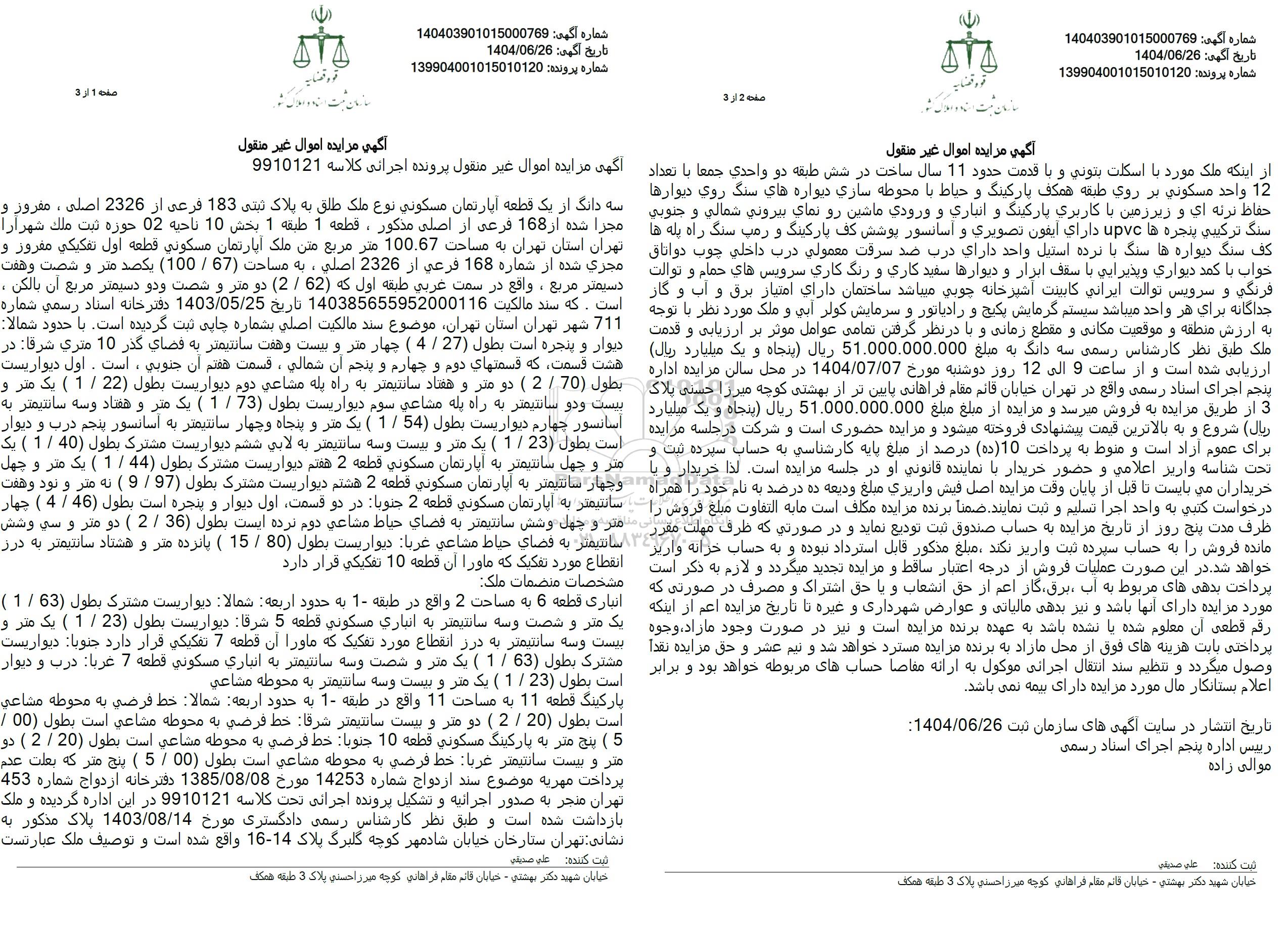 مزایده سه دانگ یک قطعه آپارتمان مسکونی نوع ملک طلق به پلاک ثبتی 186 فرعی از 2326 اصلی