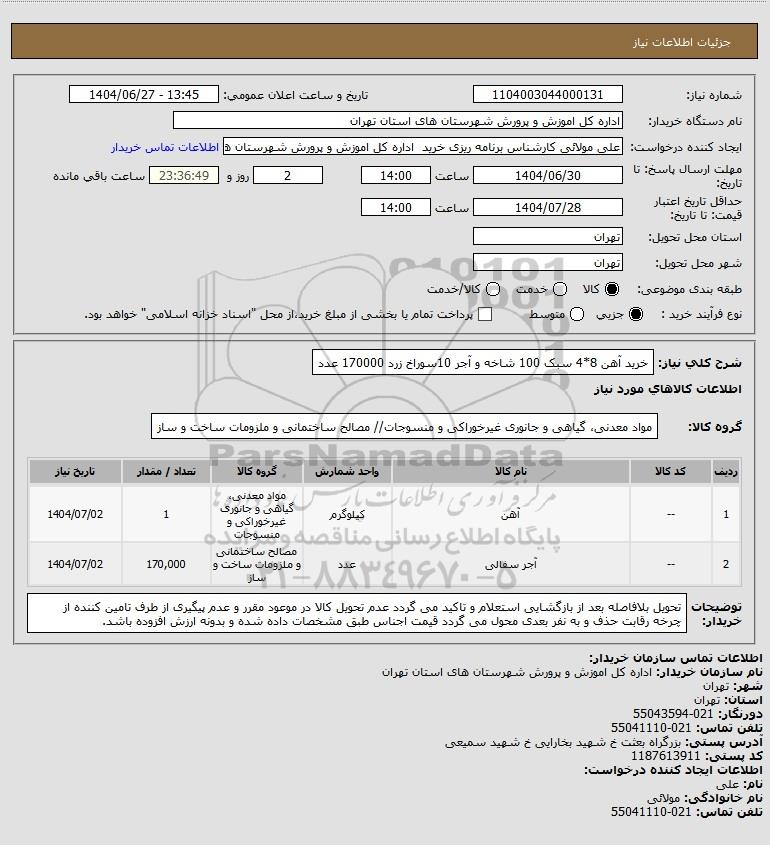 شرح کلی نیاز: خرید آهن 8*4 سبک 100 شاخه و آجر 10سوراخ زرد 170000 عدد