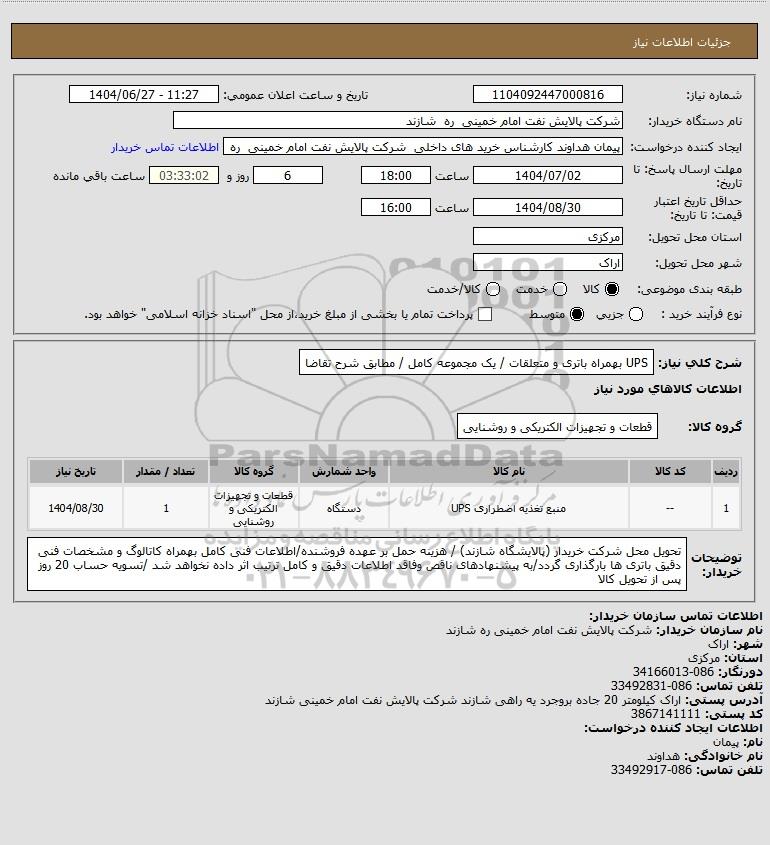 شرح کلی نیاز: UPS بهمراه باتری و متعلقات / یک مجموعه کامل / مطابق شرح تقاضا