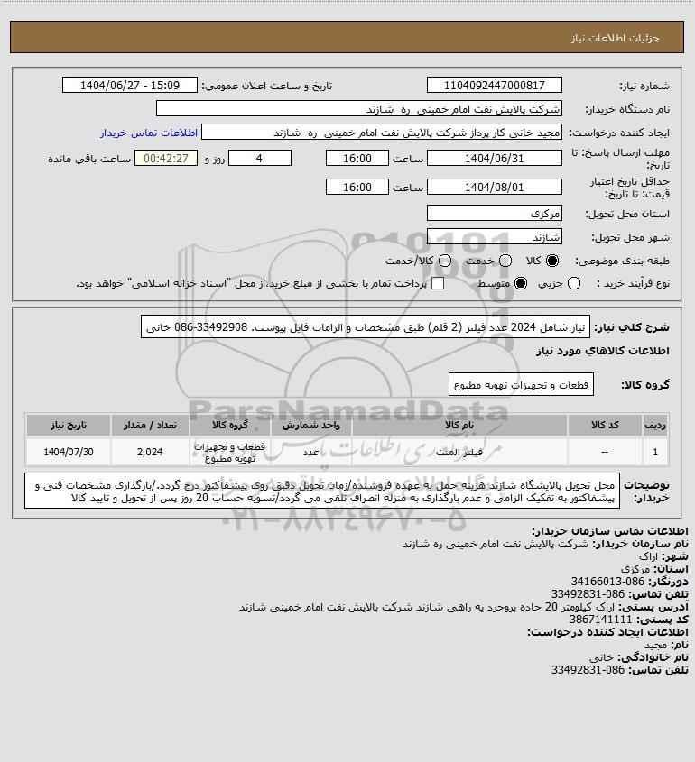 شرح کلی نیاز: نیاز شامل 2024 عدد فیلتر (2 قلم) طبق مشخصات و الزامات فایل پیوست. 33492908-086 خانی