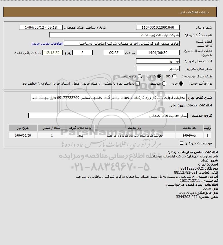 شرح کلی نیاز: معاینات ادواری طب کار ویژه کارکنان اطلاعات بیشتر آقای جاشوی :تماس:09177722769 فایل پیوست شد