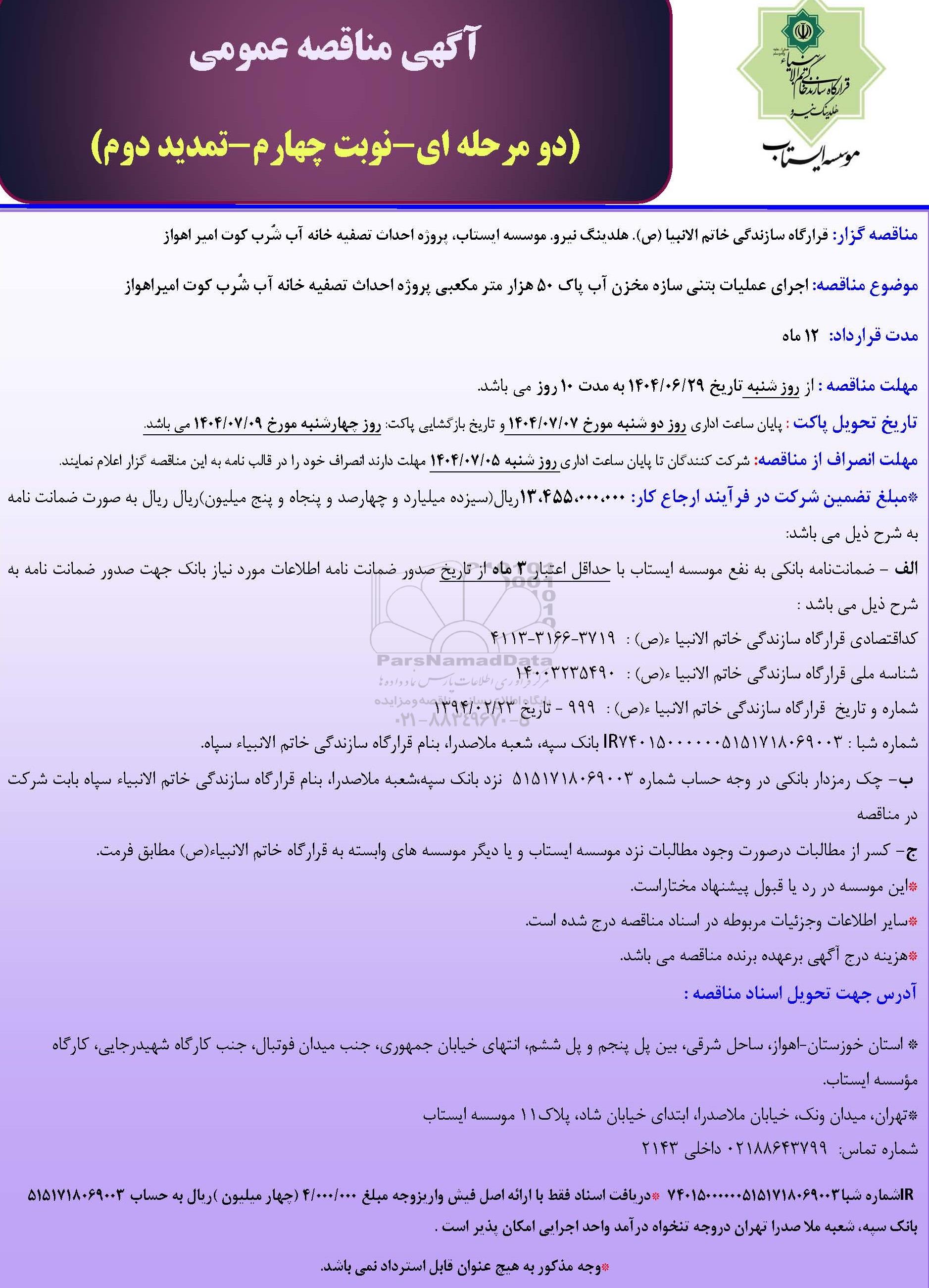 مناقصه گزار : قرارگاه سازندگی خاتم الانبیا (ص) - هلدینگ نیرو، موسسه ایستاب، پروژه احداث تصفیه خانه آب شرب کوت امیر اهواز
