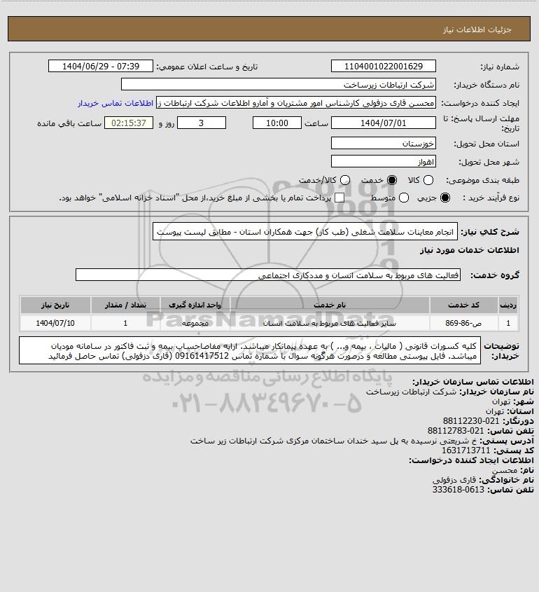 استعلام انجام معاینات سلامت شغلی (طب کار) جهت همکاران استان - مطابق لیست پیوست, استعلام انجام معاینات سلامت شغلی (طب کار) جهت همکاران استان - مطابق لیست پیوست