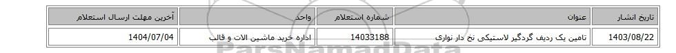 | 1403/08/22 | تامین یک ردیف گردگیر لاستیکی نخ دار نواری | 14033188 | اداره خرید ماشین الات و قالب | 1404/07/04 |