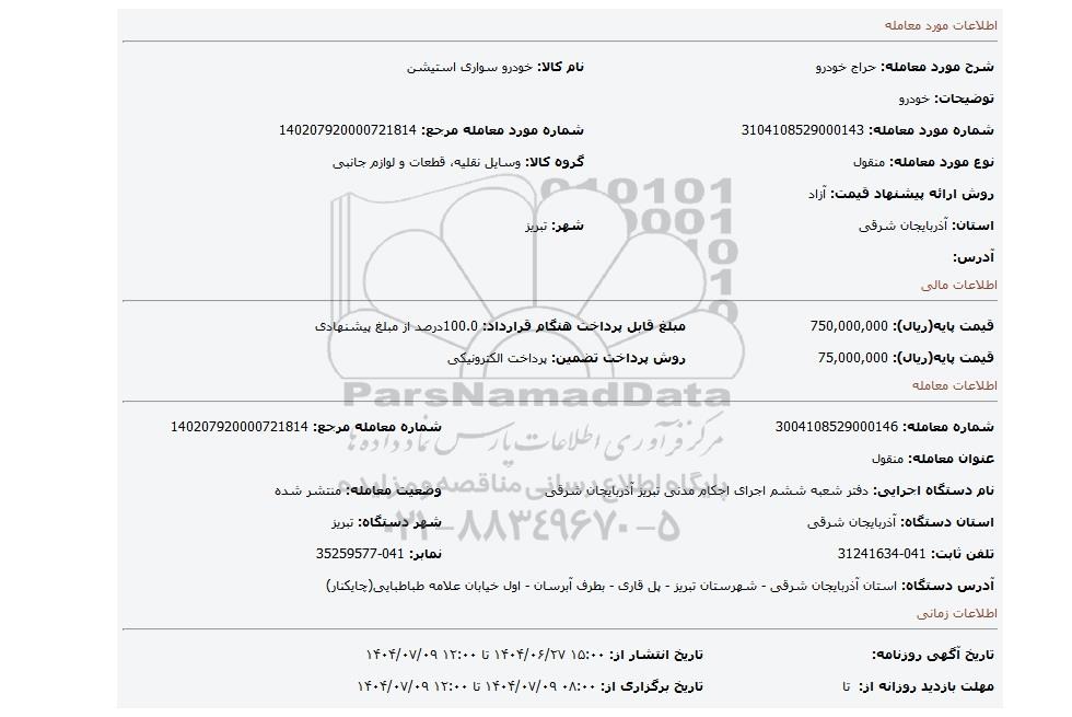 نام دستگاه اجرایی: دفتر شعبه ششم اجرای احکام مدنی تبریز آذربایجان شرقیوضعیت معامله: منتشر شده