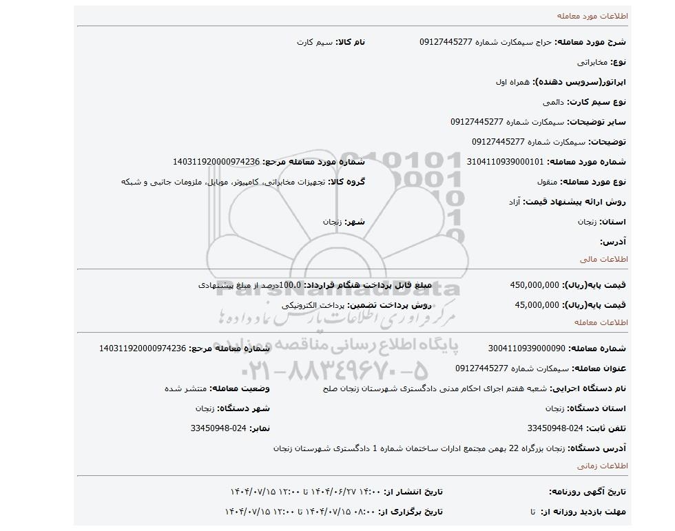 عنوان معامله: سیمکارت شماره 09127445277 | ||