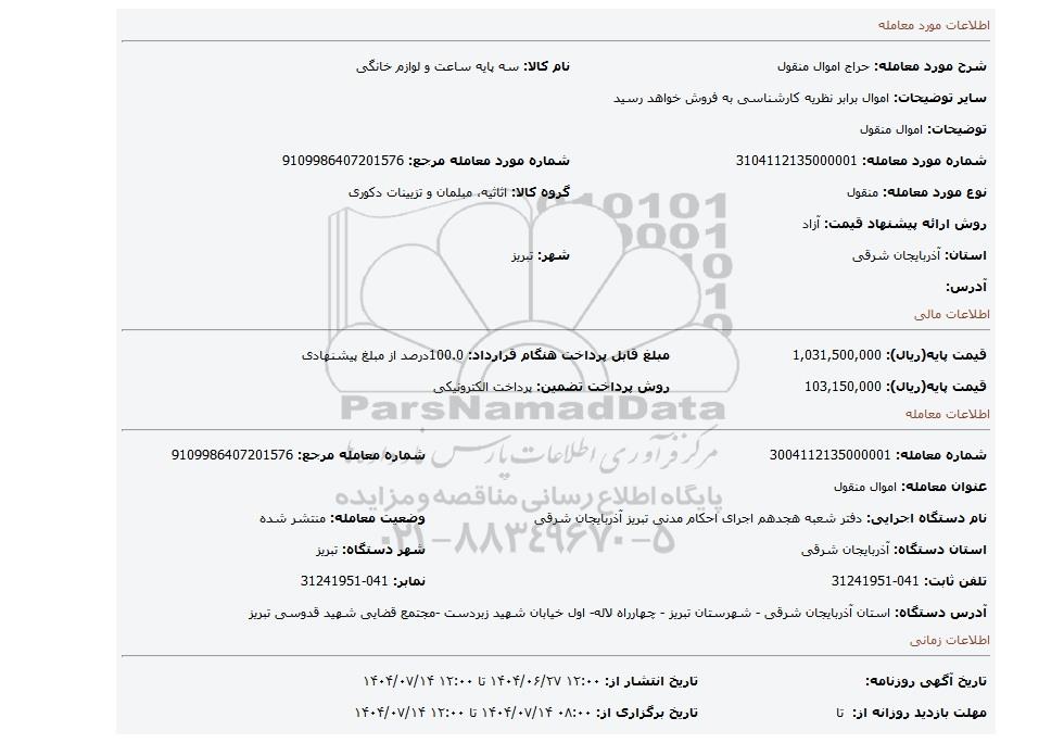 شرح مورد معامله: حراج اموال منقولنام کالا: سه پایه ساعت و لوازم خانگی