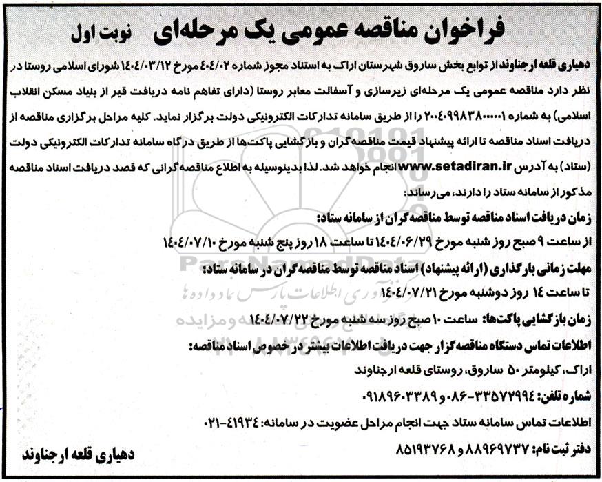 دهیاری قلعه ارجناوند از توابع بخش ساروق شهرستان اراک به استناد مجوز شماره 404/02 مورخ 1404.03.12 شورای اسلامی روستا در نظر دارد مناقصه عمومی یک مرحله ای زیرسازی و آسفالت معابر روستا (دارای تفاهم نامه دریافت قیر از بنیاد مسکن انقلاب اسلامی) به شماره 2004099838000001 را از طریق سامانه تدارکات الکترونیکی دولت برگزار نماید. کلیه مراحل برگزاری مناقصه از دریافت اسناد مناقصه تا ارایه پیشنهاد قیمت مناقصه گران و بازگشایی پاکت ها از طریق درگاه سامانه تدارکات الکترونیکی دولت (ستاد) به آدرس ستاد ایران انجام خواهد شد. لذا بدینوسیله به اطلاع مناقصه گرانی که قصد دریافت اسناد مناقصه مذکوراز سامانه ستاد را دارند، می رساند: