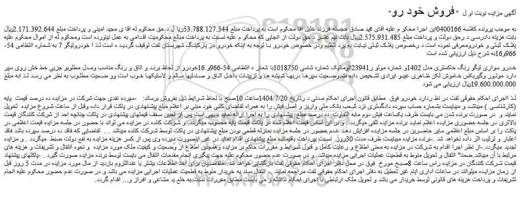 به موجب پرونده کلاسه 0400166این اجرا محکو م علیه اقای محمد صادق خجسته فرزند خلیل اقا محکوم است به پرداخت مبلغ 53.788.127.344ریا ل د حق محکوم له اقا ی مجید امینی و پرداخت مبلغ 2.171.392.644ریال بابت هزینه دادرسی د رحق دولت و پرداخت مبلغ 2.575.931.485ریال بابت نیم عشر د حق دولت از انجایی که محکو م علیه نسبت به پرداخت مبالغ محکومیت اقدامی به عمل نیاورده است ومحکوم له از اموال محکوم علیه پلاک ثبتی و خودرومعرفی نموده است د رخصوص پلاک ثبتی نیابت به یزد تنظیم ودر خصوص خودرو با توجه به اینکه خودرو در پارکینگ شهرستان تفت توقیف گردید ه است لذ ا خودروتیگو 7 به شماره انتظامی 54-966و16به شرح ذیل ارزیابی شده است