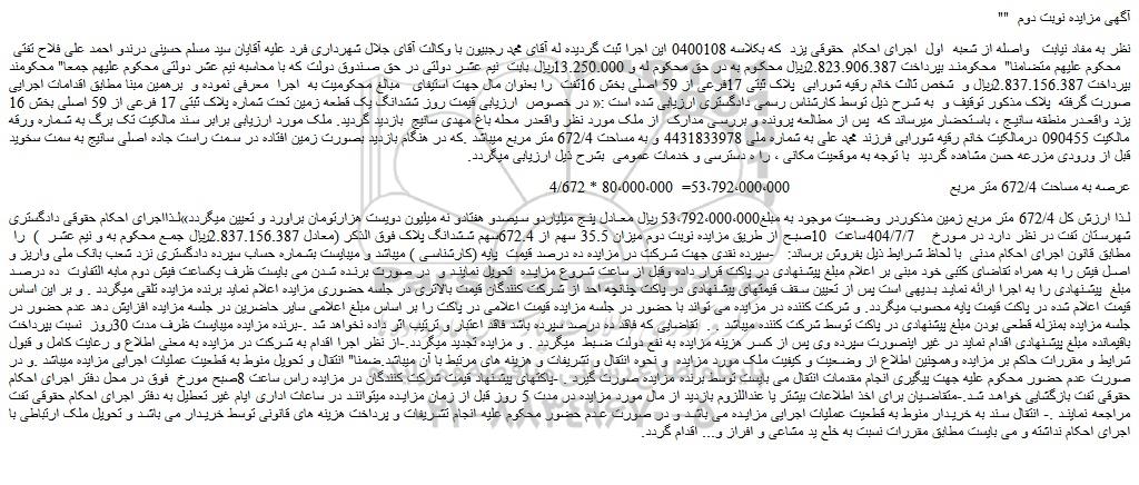لذا ارزش کل 672/4 متر مربع زمین مذکوردر وضعیت موجود به مبلغ53،792،000،000 ریال معادل پنج میلیاردو سیصدو هفتادو نه میلیون دویست هزارتومان براورد و تعیین میگردد»لذااجرای احکام حقوقی دادگستری شهرستان تفت در نظر دارد در مورخ 404/7/7ساعت 10صبح از طریق مزایده نوبت دوم میزان 35.5 سهم از 672.4سهم ششدانگ پلاک فوق الذکر (معادل 2.837.156.387ریال جمع محکوم به و نیم عشر ) را مطابق قانون اجرای احکام مدنی با لحاظ شرایط ذیل بفروش برساند: -سپرده نقدی جهت شرکت در مزایده ده درصد قیمت پایه (کارشناسی ) میباشد و میبایست بشماره حساب سپرده دادگستری نزد شعب بانک ملی واریز و اصل فیش را به همراه تقاضای کتبی خود مبنی بر اعلام مبلغ پیشنهادی در پاکت قرار داده وقبل از ساعت شروع مزایده تحویل نمایند و در صورت برنده شدن می بایست ظرف یکساعت فیش دوم مابه التفاوت ده درصد مبلغ پیشنهادی را به اجرا ارائه نماید بدیهی است پس از تعیین سقف قیمتهای پیشنهادی در پاکت چنانچه احد از شرکت کنندگان قیمت بالاتری در جلسه حضوری مزایده اعلام نماید برنده مزایده تلقی میگردد . و بر این اساس قیمت اعلام شده در پاکت قیمت پایه محسوب میگردد. و شرکت کننده در مزایده می تواند با حضور در جلسه مزایده قیمت اعلامی در پاکت را بر اساس مبلغ اعلامی سایر حاضرین در جلسه مزایده افزایش دهد عدم حضور در جلسه مزایده بمنزله قطعی بودن مبلغ پیشنهادی در پاکت توسط شرکت کننده میباشد . . تقاضایی که فاقد ده درصد سپرده باشد فاقد اعتبار و ترتیب اثر داده نخواهد شد .-برنده مزایده میبایست ظرف مدت 30روز نسبت بپرداخت باقیمانده مبلغ پیشنهادی اقدام نماید در غیر اینصورت سپرده وی پس از کسر هزینه مزایده به نفع دولت ضبط میگردد . و مزایده تجدید میگردد.-از نظر اجرا اقدام به شرکت در مزایده به معنی اطلاع و رعایت کامل و قبول شرایط و مقررات حاکم بر مزایده وهمچنین اطلاع از وضعیت و کیفیت ملک مورد مزایده و نحوه انتقال و تشریفات و هزینه های مرتبط با آن میباشد.ضمنا" انتقال و تحویل منوط به قطعیت عملیات اجرایی مزایده میباشد .و در صورت عدم حضور محکوم علیه جهت پیگیری انجام مقدمات انتقال می بایست توسط برنده مزایده صورت گیرد . -پاکتهای پیشنهاد قیمت شرکت کنندگان در مزایده راس ساعت 8صبح مورخ فوق در محل دفتر اجرای احکام حقوقی تفت بازگشایی خواهد شد.-متقاضیان برای اخذ اطلاعات بیشتر یا عنداللزوم بازدید از مال مورد مزایده در مدت 5 روز قبل از زمان مزایده میتوانند در ساعات اداری ایام غیر تعطیل به دفتر اجرای احکام حقوقی تفت مراجعه نمایند .- انتقال سند به خریدار منوط به قطعیت عملیات اجرایی مزایده می باشد و در صورت عدم حضور محکوم علیه انجام تشریفات و پرداخت هزینه های قانونی توسط خریدار می باشد و تحویل ملک ارتباطی با اجرای احکام نداشته و می بایست مطابق مقررات نسبت به خلع ید مشاعی و افراز و... اقدام گردد.