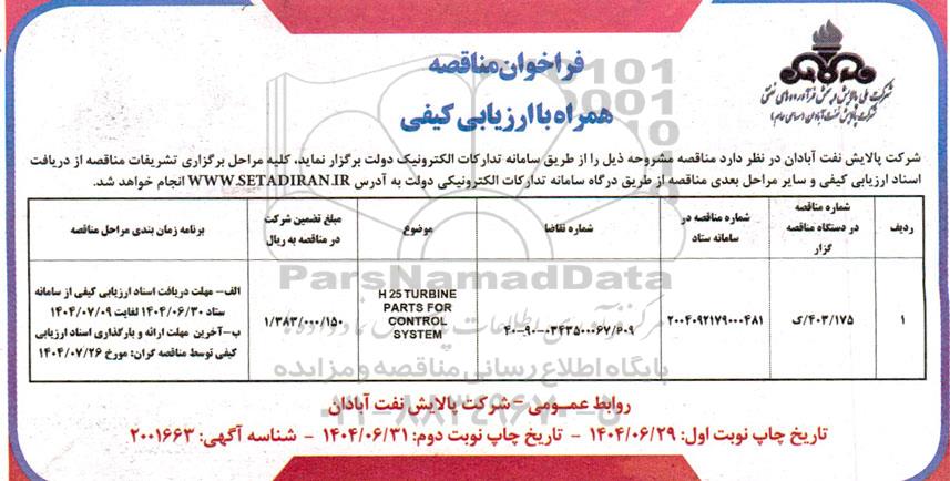 علاقهمندان میتوانند جهت دریافت اسناد و اطلاعات تکمیلی، مناقصه H25 TURBINE PARTS FOR CONTROL SYSTEM با سامانه مناقصات و مزایدات ایران پارسنماد داده ها 88349670 تماس حاصل نمایند.