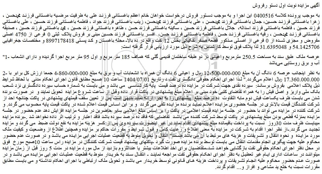 2- به نظر اینجانب عرصه 6 دانگ آن به مبلغ 12،500،000،000 ریال و اعیانی 6 دانگ آن همراه با انشعابات آب و برق به مبلغ 4،860،000،000 جمعا ارزش کل برابر با 17.360.000.000 ریال اعلام می گردد." لذا اجرای احکام حقوقی دادگستری تفت د رتاریخ 1404/07/01 ساعت 10 صبح مطابق قانون اجرای احکام مدنی با لحاظ شرایط ذیل پلاک اعلامی بفروش برساند: سپرده نقدی جهت شرکت در مزایده ده درصد قیمت پایه کارشناسی می باشد و می بایست به شماره حساب سپرده دادگستری نزد شعب بانک ملی واریز و اصل فیش را به همراه تقاضای کتبی خود مبنی بر اعلام مبلغ پیشنهادی در پاکت قرار داده وقبل از ساعت شروع مزایده تحویل نمایند و در صورت برنده شدن می بایست ظرف یکساعت فیش دوم مابه التفاوت ده درصد مبلغ پیشنهادی را به اجرا ارائه نماید بدیهی است پس از تعیین سقف قیمتهای پیشنهادی در پاکت چنانچه احد از شرکت کنندگان قیمت بالاتری در جلسه حضوری مزایده اعلام نماید برنده مزایده تلقی می گردد و بر این اساس قیمت اعلام شده در پاکت قیمت پایه محسوب می گردد. و شرکت کننده در مزایده می تواند با حضور در جلسه مزایده قیمت اعلامی در پاکت را بر اساس مبلغ اعلامی سایر حاضرین در جلسه مزایده افزایش دهد عدم حضور در جلسه مزایده بمنزله قطعی بودن مبلغ پیشنهادی در پاکت توسط شرکت کننده می باشد تقاضایی که فاقد ده درصد سپرده باشد فاقد اعتبار و ترتیب اثر داده نخواهد شد .-برنده مزایده میبایست ظرف مدت 30روز نسبت به پرداخت باقیمانده مبلغ پیشنهادی اقدام نماید در غیر اینصورت سپرده وی پس از کسر هزینه مزایده به نفع دولت ضبط می گردد و مزایده تجدید می گردد.-از نظر اجرا اقدام به شرکت در مزایده به معنی اطلاع و رعایت کامل و قبول شرایط و مقررات حاکم بر مزایده وهمچنین اطلاع از وضعیت و کیفیت ملک مورد مزایده و نحوه انتقال و تشریفات و هزینه های مرتبط با آن می باشد.ضمنا" انتقال و تحویل منوط به قطعیت عملیات اجرایی مزایده می باشد و در صورت عدم حضور محکوم علیه جهت پیگیری انجام مقدمات انتقال می بایست توسط برنده مزایده صورت گیرد -پاکتهای پیشنهاد قیمت شرکت کنندگان در مزایده راس ساعت 10صبح مورخ فوق در محل دفتر اجرای احکام حقوقی تفت بازگشایی خواهد شد-متقاضیان برای اخذ اطلاعات بیشتر یا عنداللزوم بازدید از مال مورد مزایده در مدت 5 روز قبل از زمان مزایده میتوانند در ساعات اداری ایام غیر تعطیل به دفتر اجرای احکام حقوقی تفت مراجعه نمایند - انتقال سند به خریدار منوط به قطعیت عملیات اجرایی مزایده می باشد و در صورت عدم حضور محکوم علیه انجام تشریفات و پرداخت هزینه های قانونی توسط خریدار می باشد و تحویل ملک ارتباطی با اجرای احکام نداشته و می بایست مطابق مقررات نسبت به خلع ید مشاعی و افراز و... اقدام گردد.