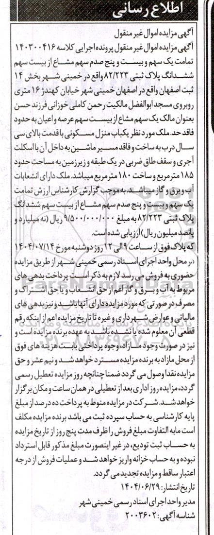 آگهی مزایده اموال غیر منقول پرونده اجرایی کلاسه 140300416 تمامت یک سهم و بیست و پنج صدم سهم مشاع از بیست سهم  ششدانگ پلاک ثبتی 82.223 واقع در خمینی شهر بخش 14 ثبت اصفهان واقع در اصفهان خمینی شهر خیابان کهندژ 16 متری | روبروی مسجد ابوالفضل مالکیت رحمن کاملی خوزانی فرزند حسن بعنوان مالک یک سهم مشاع از بیست سهم عرصه و اعیان به حدود فاقد حد ملک مورد نظر یکباب منزل مسکونی با قدمت بالای سی سال درب به ساخت و فاقد مسیر ماشین به داخل آن با اسکلت آجری و سقف طاق ضربی در یک طبقه و زیر زمین به مساحت حدود 185 متر مربع و ساخت 180 متر مربع میباشد. ملک دارای انشعابات آب و برق و گاز میباشد. به موجب گزارش کارشناس ارزش تمامت یک سهم و بیست و پنج صدم سهم مشاع از بیست سهم ششدانگ پلاک ثبتی 82.223 به مبلغ 9.500.000.000 ریال نه میلیارد وپانصد میلیون ریال ارزیابی شده است.
