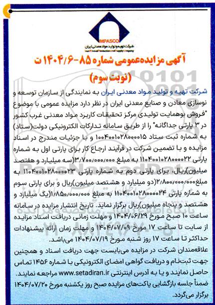 شرکت تهیه و تولید مواد معدنی ایران به نمایندگی از سازمان توسعه و نوسازی معادن و صنایع معدنی ایران در نظر دارد مزایده عمومی با موضوع (فروش بوهمایت تولیدی مرکز تحقیقات کاربرد مواد معدنی غرب کشور در 3 پارتی جداگانه را از طریق سامانه تدارکات الکترونیکی دولت (ستاد) به شماره ثبت ستاد 1004001028000015 و با جزئیات مندرج در اسناد مزایده و با تضمین شرکت در فرآیند ارجاع کار برای پارتی اول به شماره پارتی 1104001028000022 به مبلغ 3.700.000.000 ریال (سه میلیارد و هفتصد میلیون) ریال برای پارتی دوم به شماره پارتی 1104001028000023 به مبلغ 2.800.000.000 ریال (دو میلیارد و هشتصد میلیون) ریال و برای پارتی سوم به شماره پارتی 1104001028000024 به مبلغ 1.850.000.000 ریال (یک میلیارد و هشتصد و پنجاه میلیون) ریال برگزار نماید.
