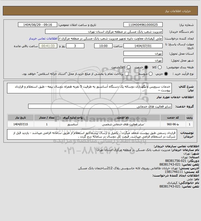 شرح کلی نیاز: خدمات سرویس و نگهداری دوساله یک دستگاه آسانسور به طرفیت 5 نفربه همراه دوسال بیمه - طبق استعلام و قرارداد پیوست –