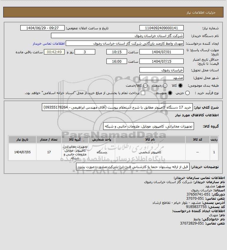 شرح کلی نیاز: خرید 17 دستگاه کامپیوتر مطابق با شرح استعلام پیوست (آقای مهندس ابراهیمی - 09355178264)