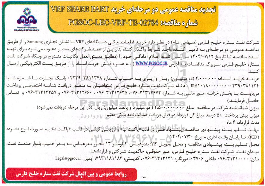 شماره مناقصه: PGSOC-LEC- VRF - TE - 02784