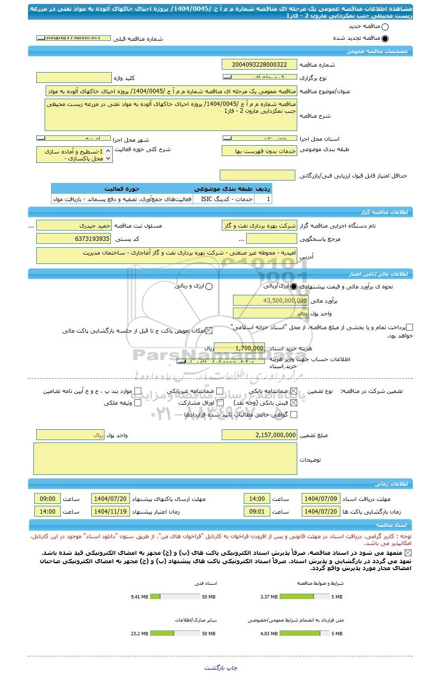 | عنوان/موضوع مناقصه | مناقصه عمومی یک مرحله ای مناقصه شماره م م آ ج /1404/0045/ پروژه احیای خاکهای آلوده به مواد نفتی در مزرعه زیست محیطی جنب نمکزدایی مارون 2 - فاز1 | ||||||||