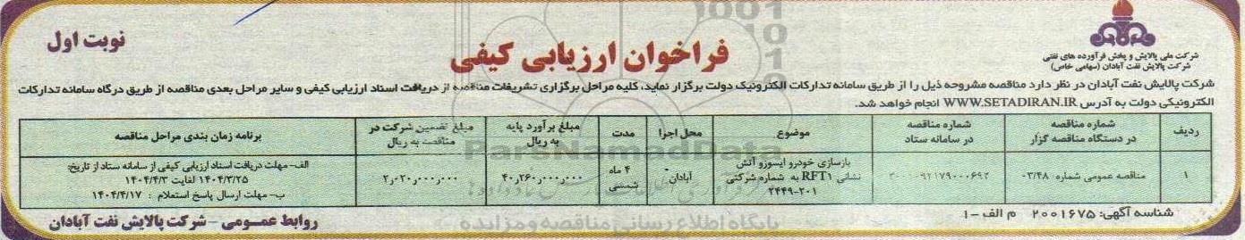 2001092179000692  بازسازی خودرو ایسوزو و آتش نشانی RFT1 به شماره شرکتی 201-2449 آبادان 4 ماه شمسی 40.260.000.000 2.020.000.000