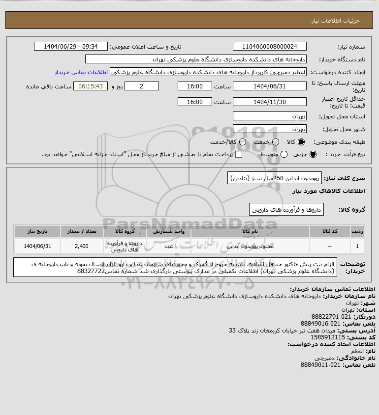 | 1 | -- | محلول پوویدون آیداین | عدد | داروها و فرآورده های دارویی | 2,400 | 1404/06/31 |