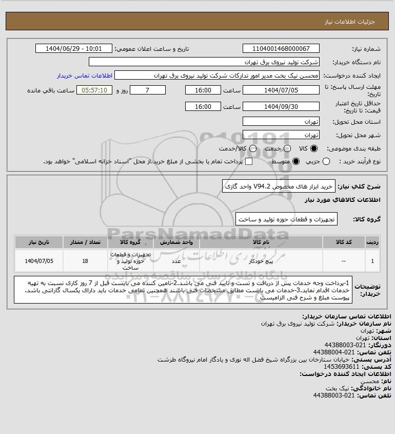 شرح کلی نیاز: خرید ابزار های مخصوص V94.2 واحد گازی