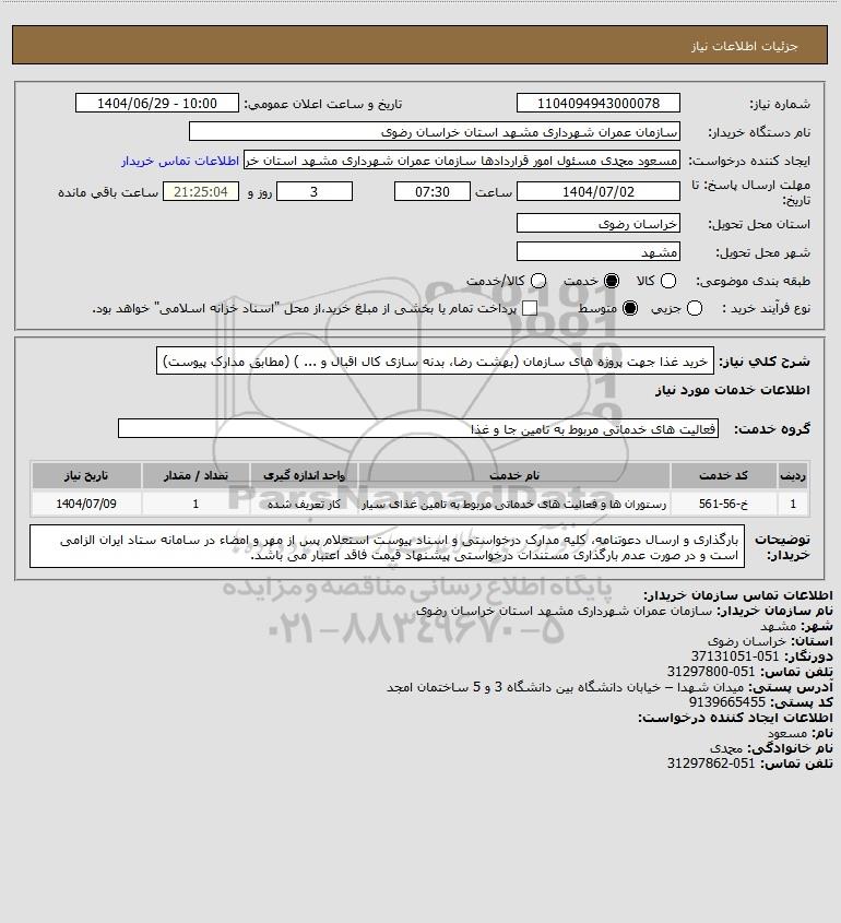 شرح کلی نیاز: خرید غذا جهت پروژه های سازمان (بهشت رضا، بدنه سازی کال اقبال و ... ) (مطابق مدارک پیوست)